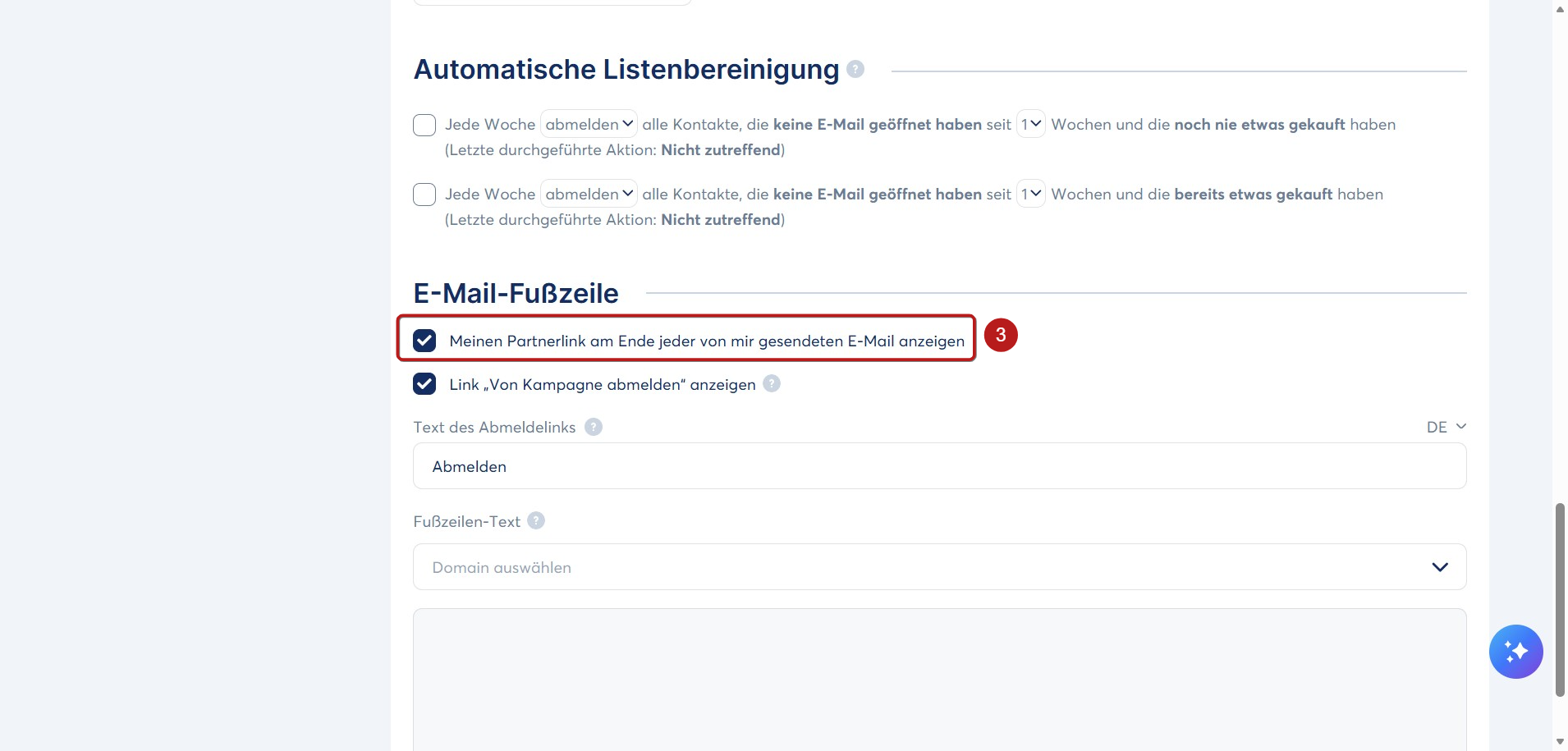 Um die Fußzeile „Gesendet mit systeme.io“ aus Ihren E-Mails zu entfernen, deaktivieren Sie die Option Meinen Partnerlink am Ende jeder von mir gesendeten E-Mail anzeigen (3).