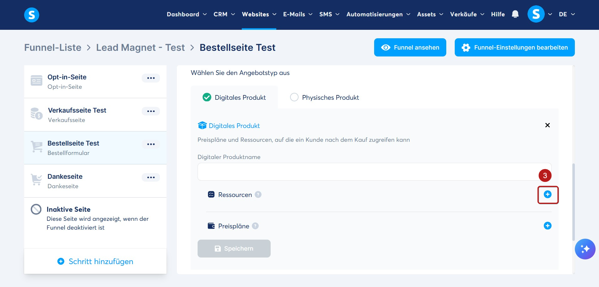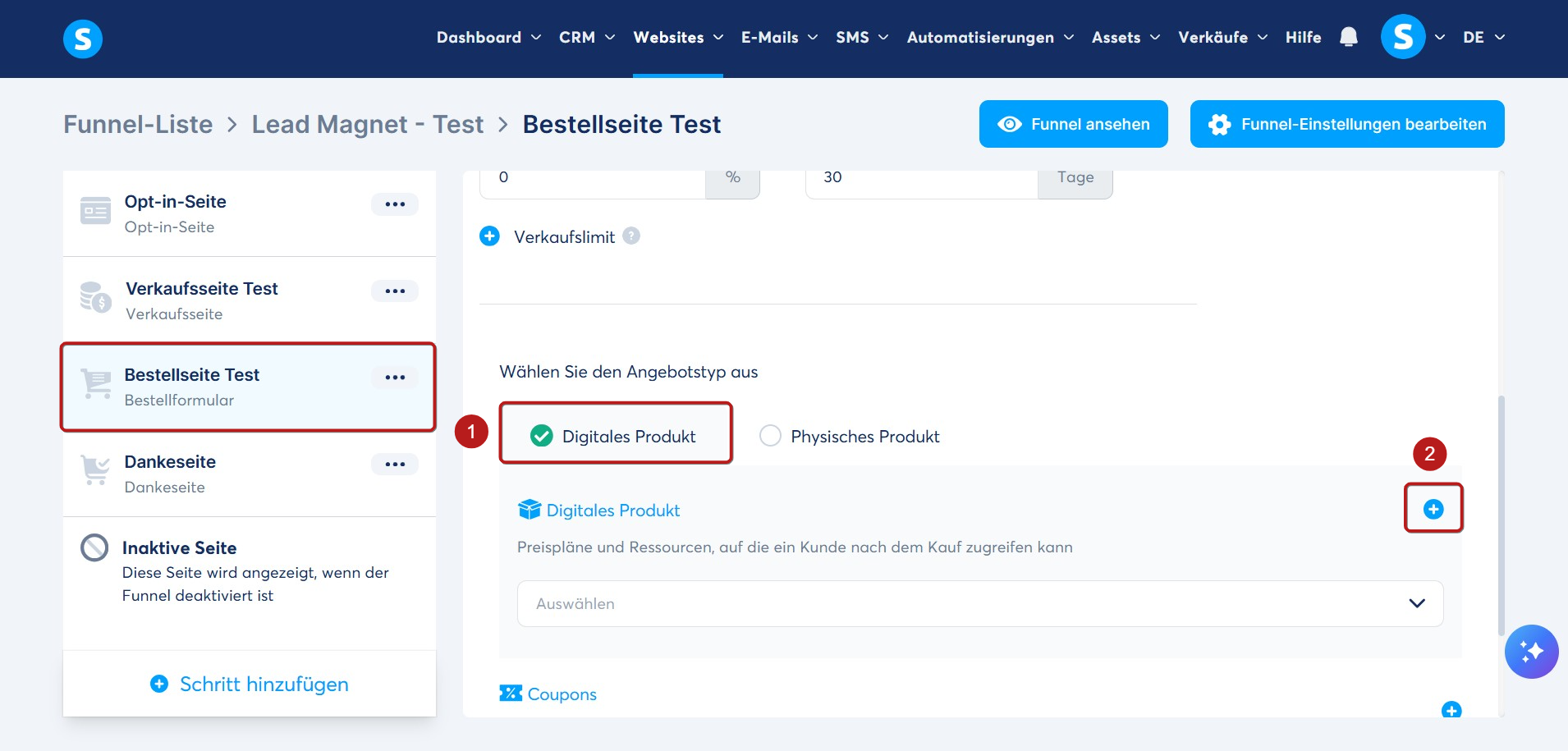 Wählen Sie in Ihrem Verkaufsfunnel den Schritt Bestellformular aus. Wählen Sie unter „Angebotstyp auswählen“ die Option Digitales Produkt (1). Klicken Sie auf das Plus-Symbol (+) (2), um ein neues digitales Produkt zu erstellen.