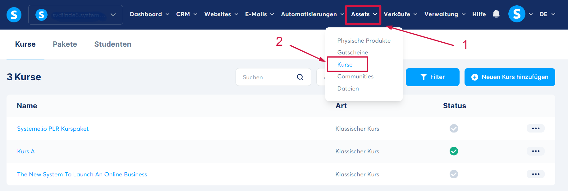 Klicken Sie im Menü auf den Reiter „Assets“ (1) und anschließend auf „Kurse“ (2).