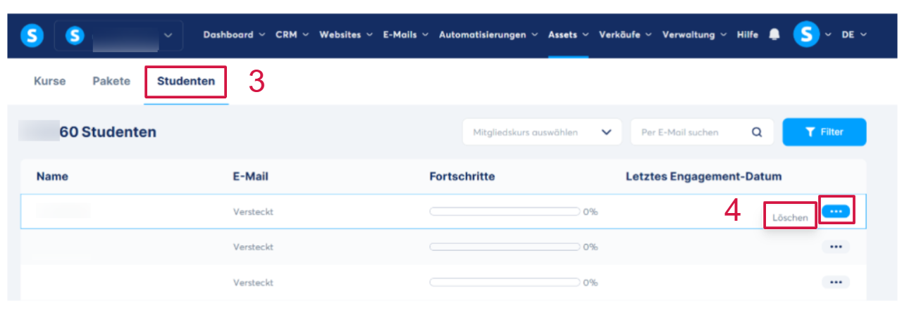 Suchen Sie in der Liste der Studenten denjenigen, den Sie entfernen möchten, und klicken Sie auf die drei Punkte (...), dann auf „Löschen“ (4).