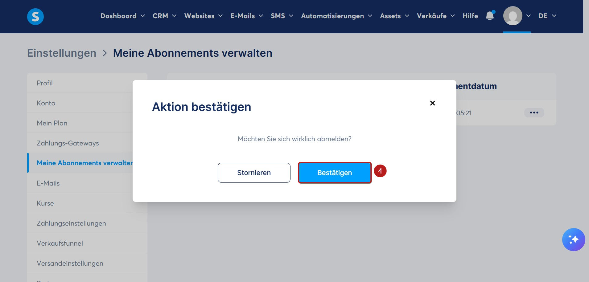 Um Ihr Abonnement zu kündigen, klicken Sie im angezeigten Popup auf Bestätigen (4).