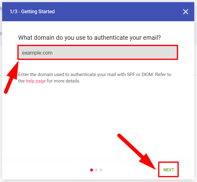 Geben Sie im erscheinenden Popup-Fenster die zu verifizierende Domain ein und klicken Sie anschließend auf „Weiter“ (Next).
