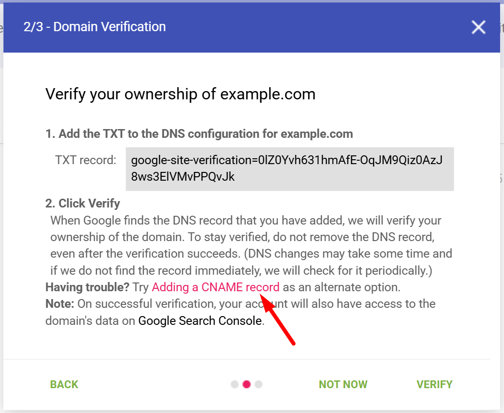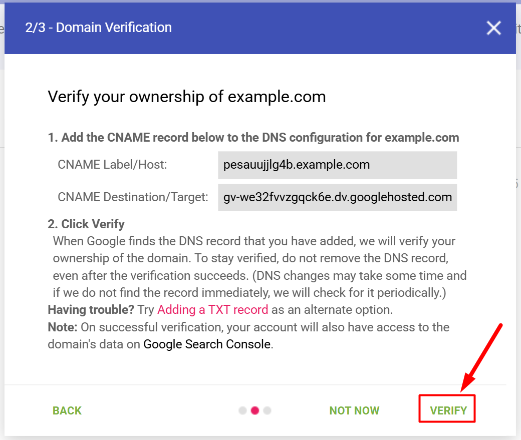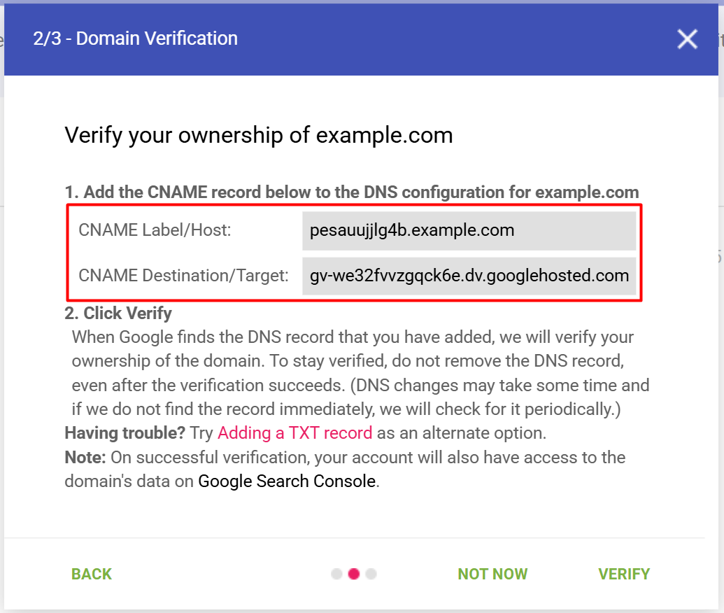 Kopieren Sie den Wert des TXT-Eintrags aus dem Popup, damit er in Ihrer DNS-Konfiguration hinzugefügt werden kann.