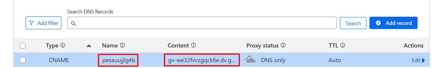 Fügen Sie die Zeile „CNAME Label/Host“ in das „Name“-Feld Ihrer DNS-Zone ein. Holen Sie sich die Zeile „CNAME Destination/Target“ und fügen Sie sie in das „Content“-Feld der DNS-Zone Ihres Hosting-Anbieters ein.