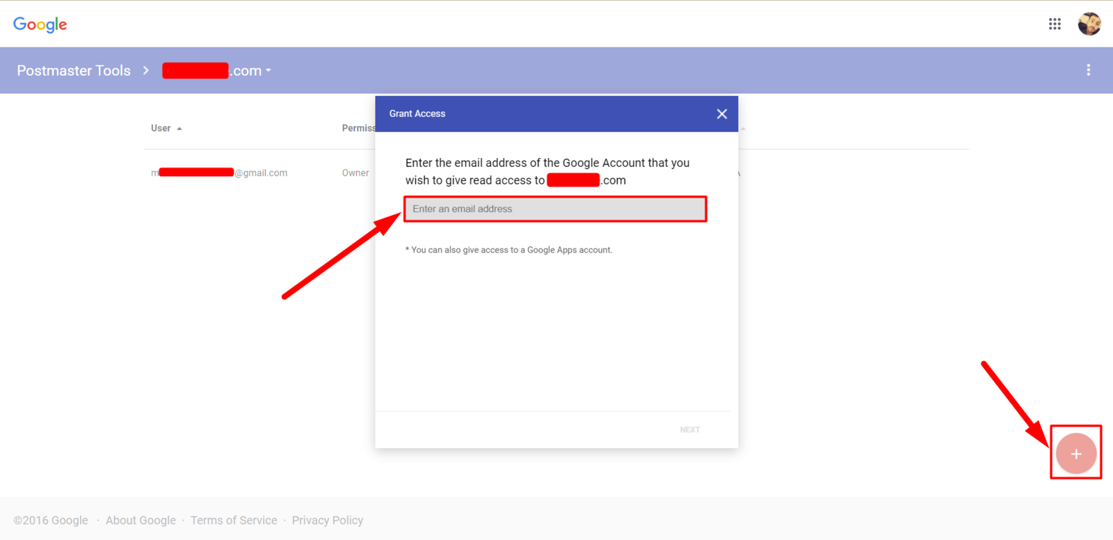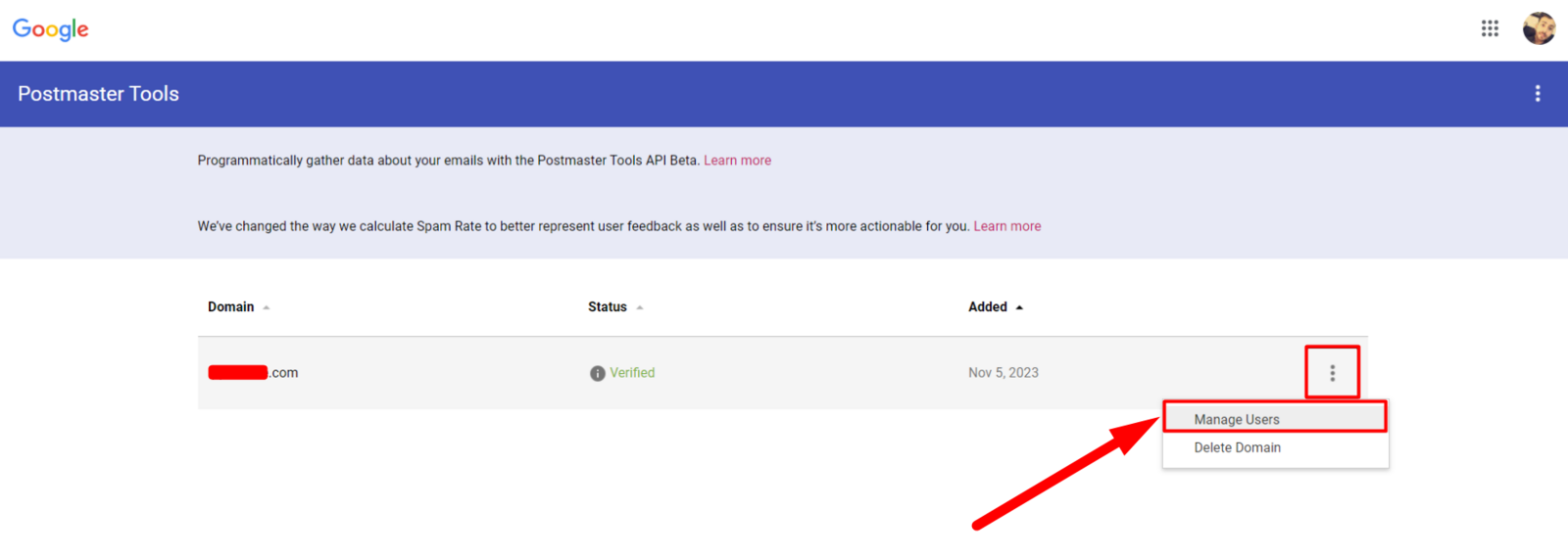 Sie können unserem Team Zugriff auf die Google Postmaster Tool-Daten gewähren, indem Sie uns als Benutzer für jede Domain hinzufügen.