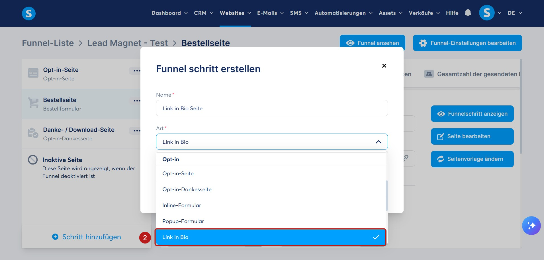 Wählen Sie im Feld Typ Link in Bio (2) aus.