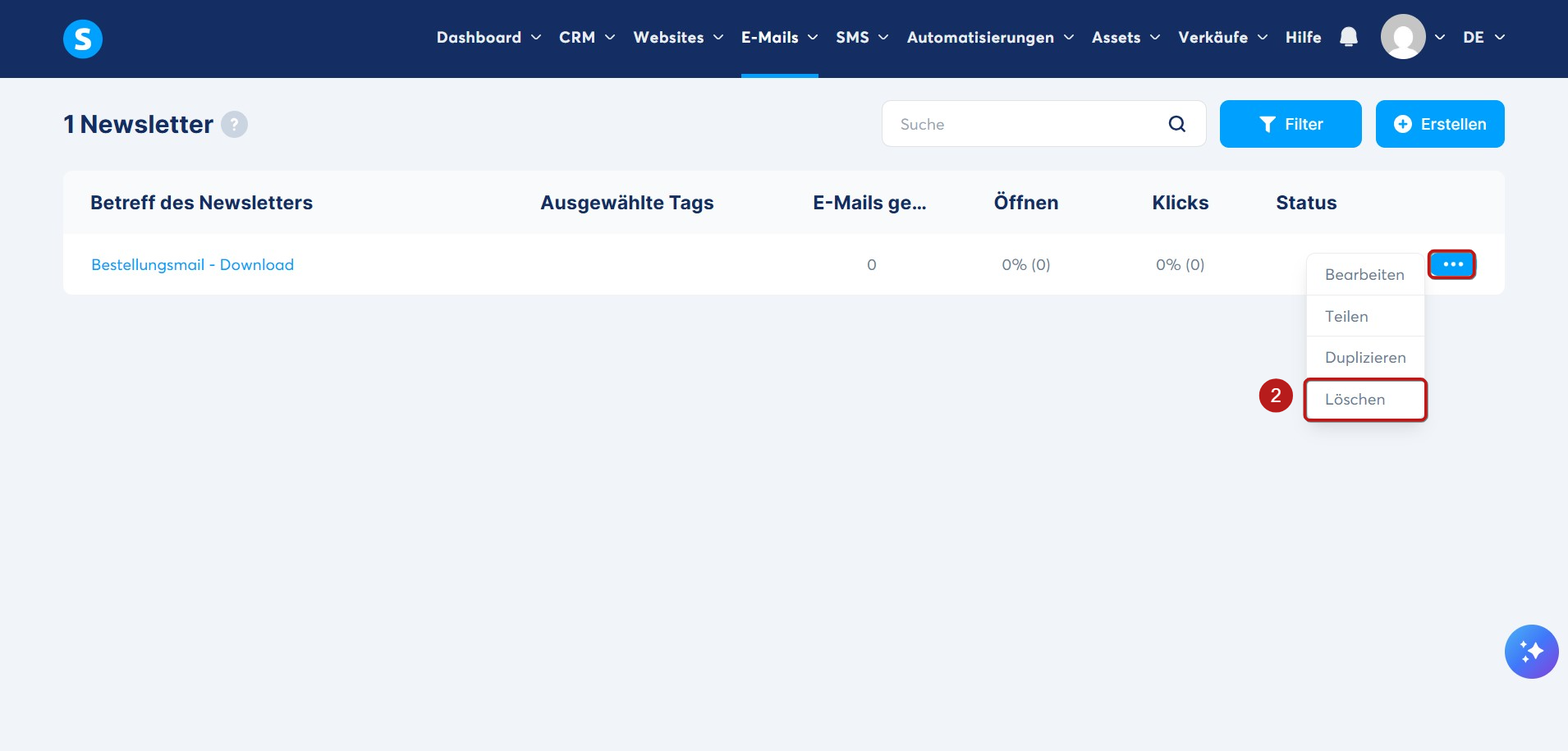 Suchen Sie den Newsletter, den Sie löschen möchten, klicken Sie auf die drei Punkte (...), und dann auf Löschen (2).