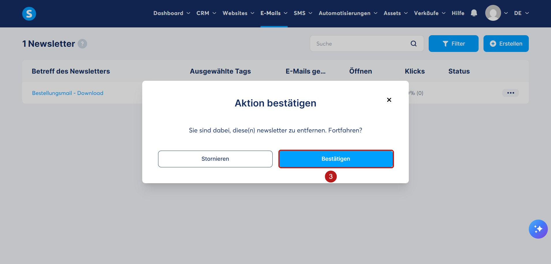 Klicken Sie auf Bestätigen (3), um den Newsletter dauerhaft zu löschen.