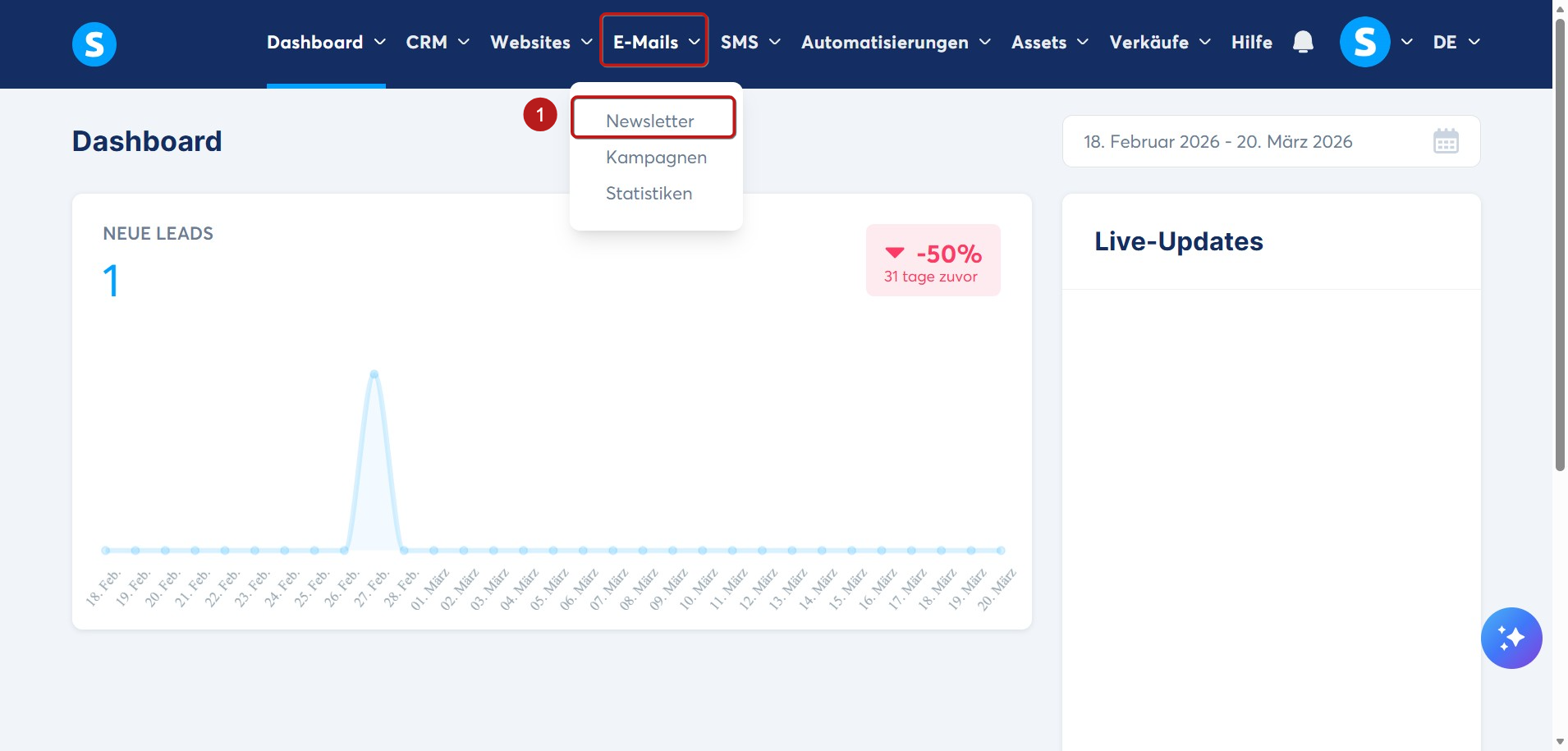 Klicken Sie in der Menüleiste auf E-Mails und dann auf Newsletter (1).
