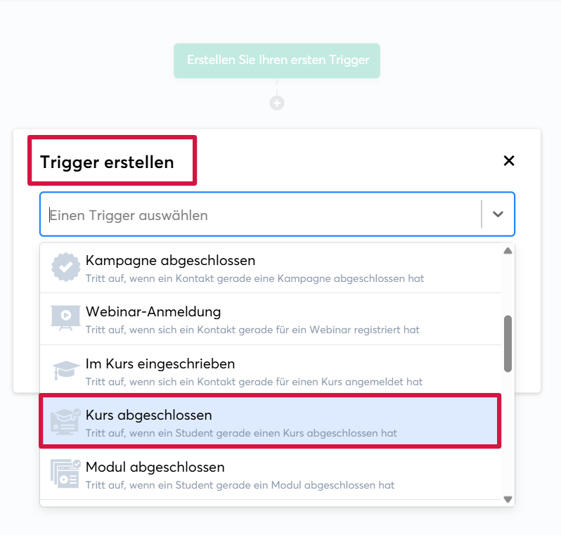 So lösen Sie Automatisierungen aus, wenn ein Kurs, ein Modul oder eine Vorlesung abgeschlossen ist