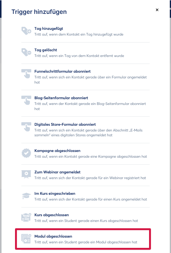 Wählen Sie den Trigger „Modul abgeschlossen“ für Ihre Regel: