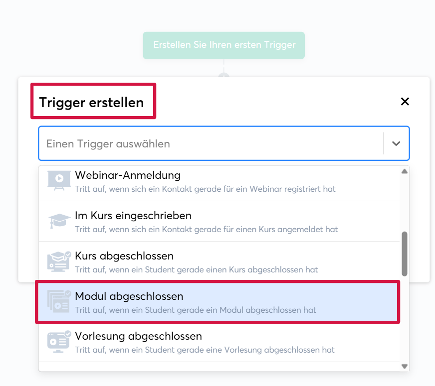 Wählen Sie den Trigger „Modul abgeschlossen“ und anschließend den Kurs aus, für den Sie die Workflow-Aktionen auslösen möchten.
