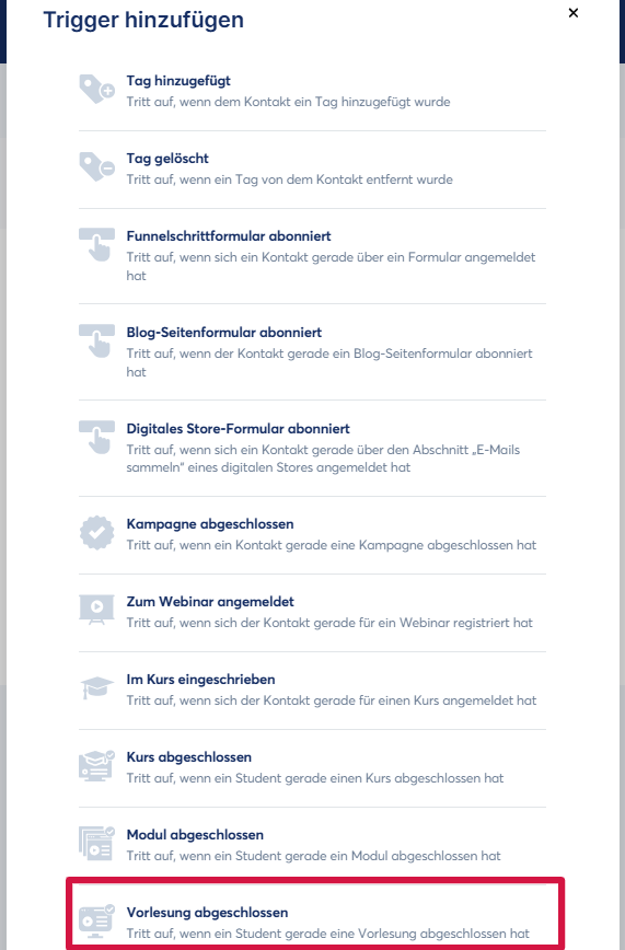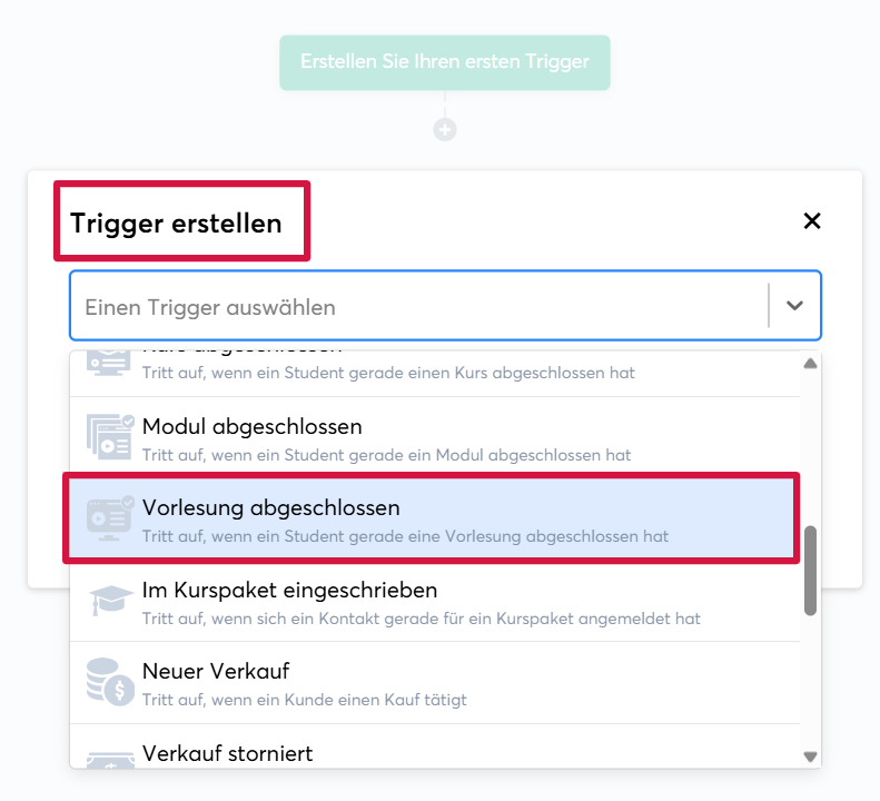 Wählen Sie den Trigger „Vorlesung abgeschlossen“ für Ihre Regel: