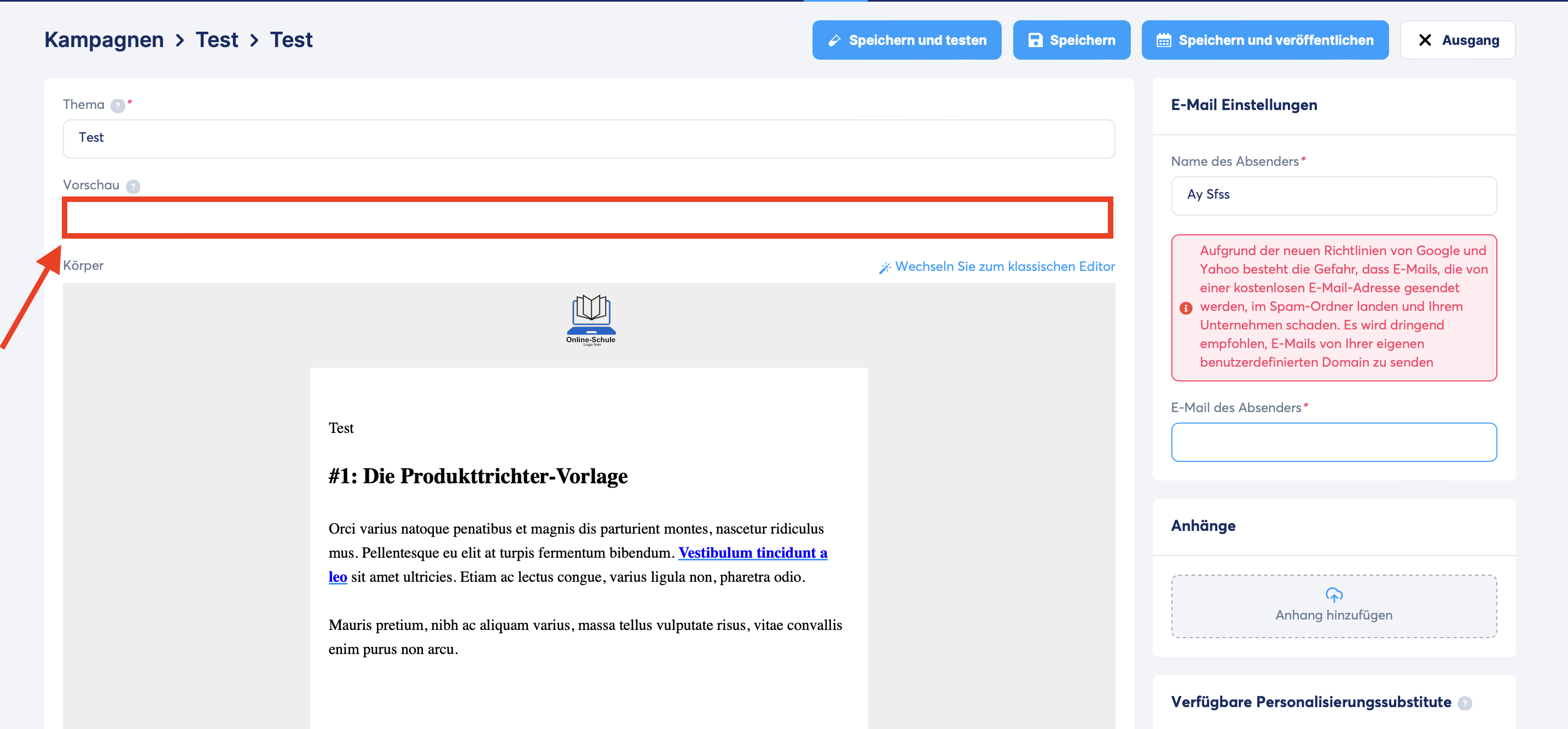 Wichtig: Wenn Sie keine Vorschau zu Ihrer E-Mail hinzufügen und diese leer bleibt, zeigt unser System automatisch die ersten Worte der E-Mail als Vorschau an.