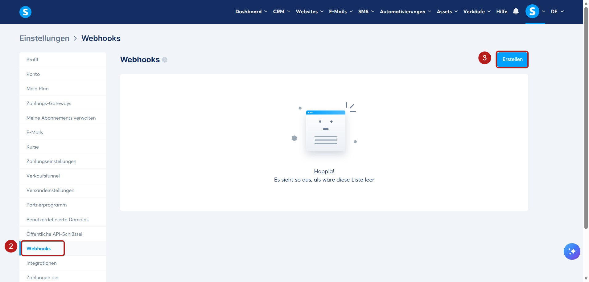 Klicken Sie auf Webhooks (2) und anschließend auf Erstellen (3), um mit der Erstellung eines Webhooks zu beginnen.