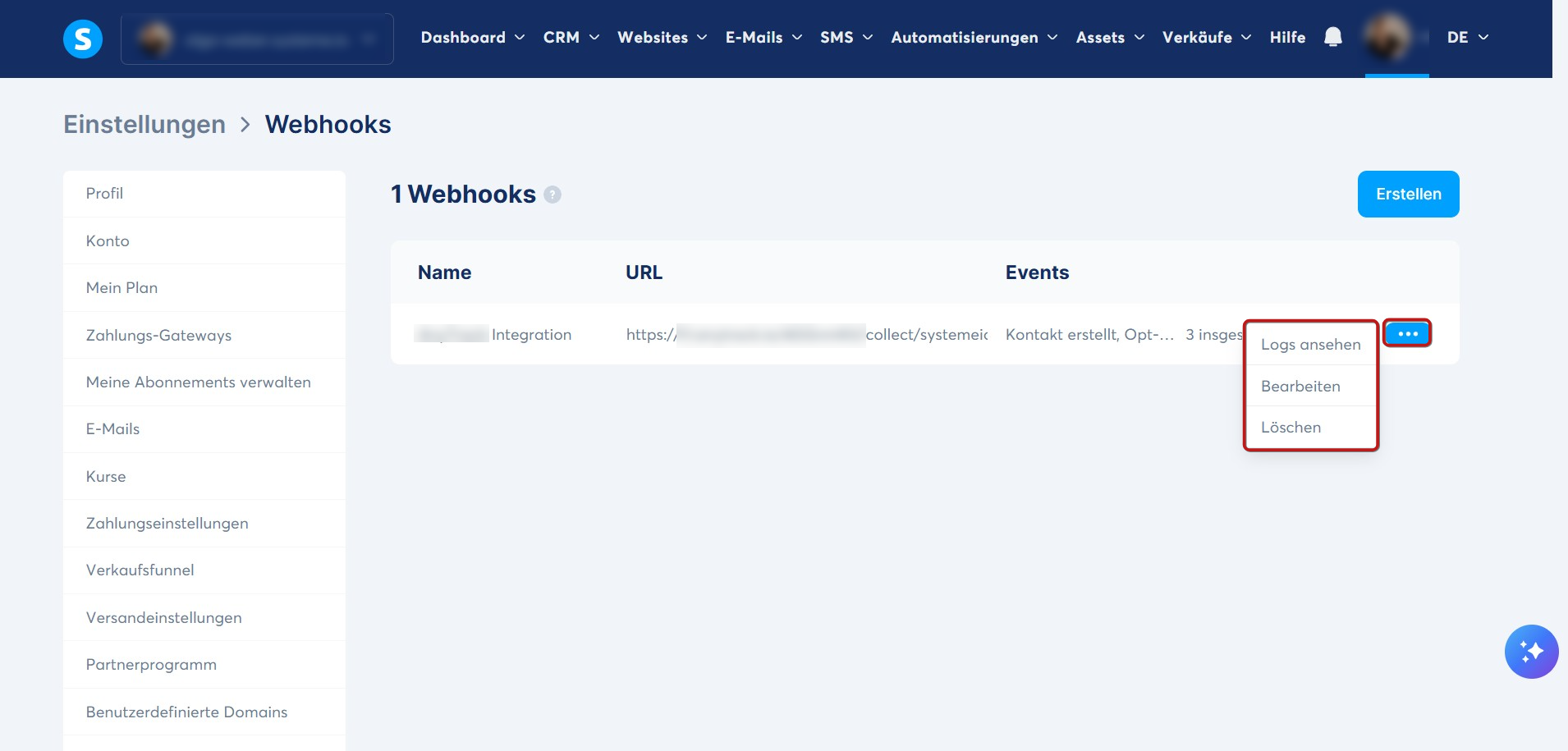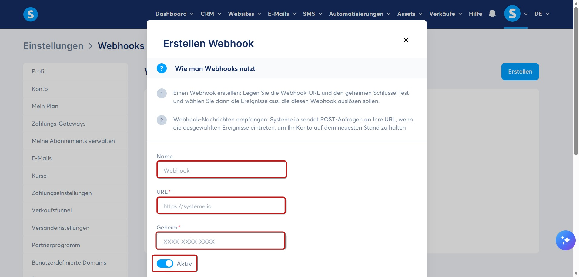Um einen Webhook in Ihrem systeme.io-Konto einzurichten, folgen Sie diesen einfachen Schritten: