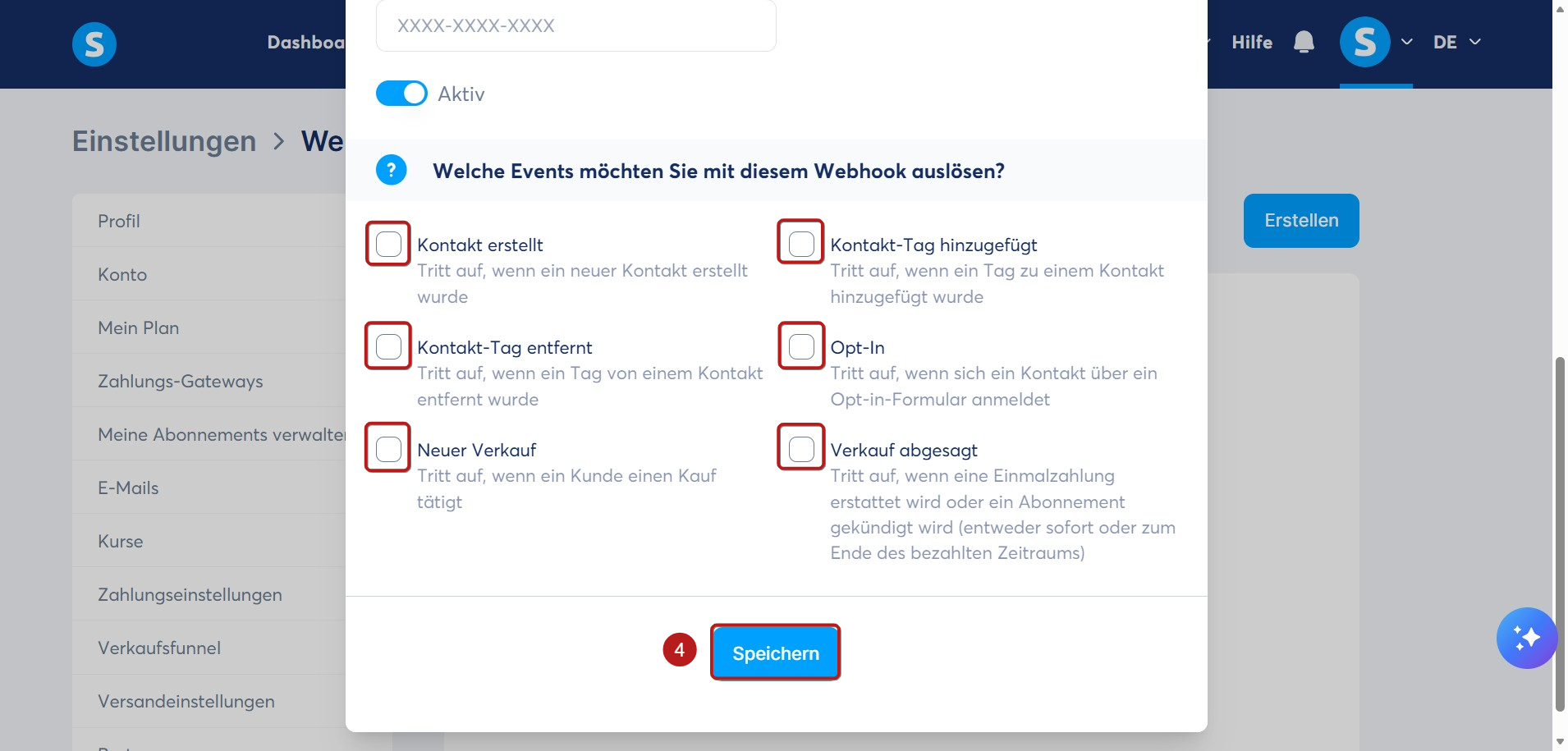 Wählen Sie die spezifischen Ereignisse aus, die den Webhook in systeme.io auslösen sollen, und klicken Sie auf Speichern (4), um die Erstellung zu bestätigen.