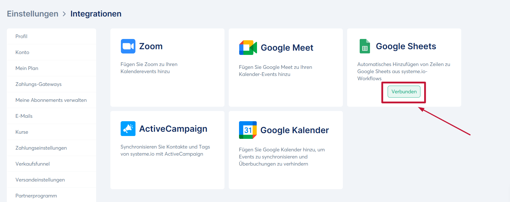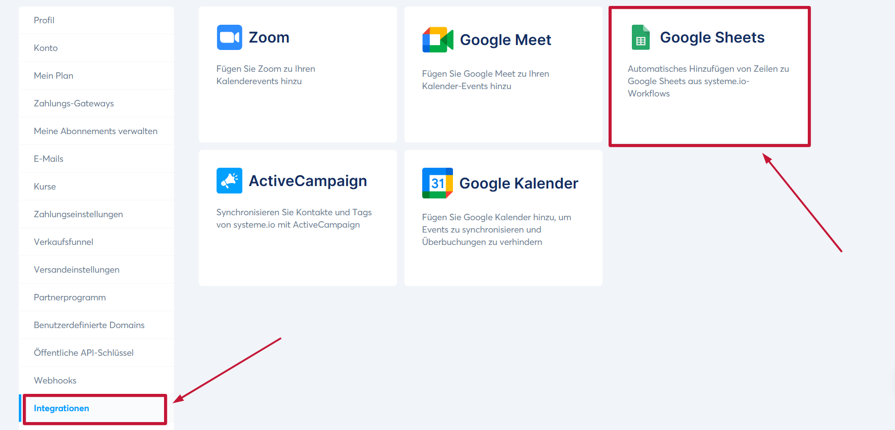 - Klicken Sie unter den verschiedenen verfügbaren Integrationen auf „Google Sheets“, um ein Google-Konto mit Ihrem systeme.io-Konto zu verbinden.