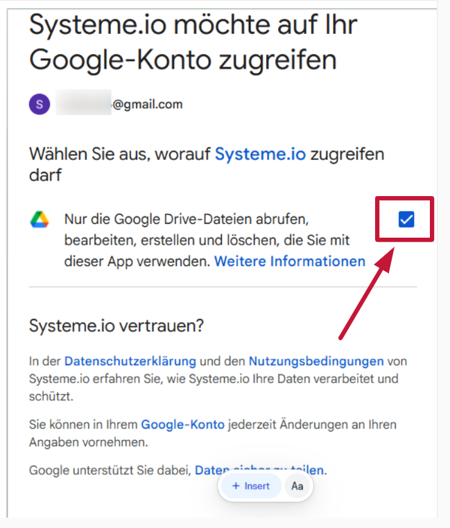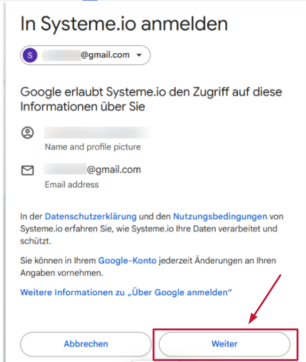 6. Klicken Sie auf "Weiter", um Google die Erlaubnis zu erteilen, Ihre Informationen mit systeme.io zu teilen.