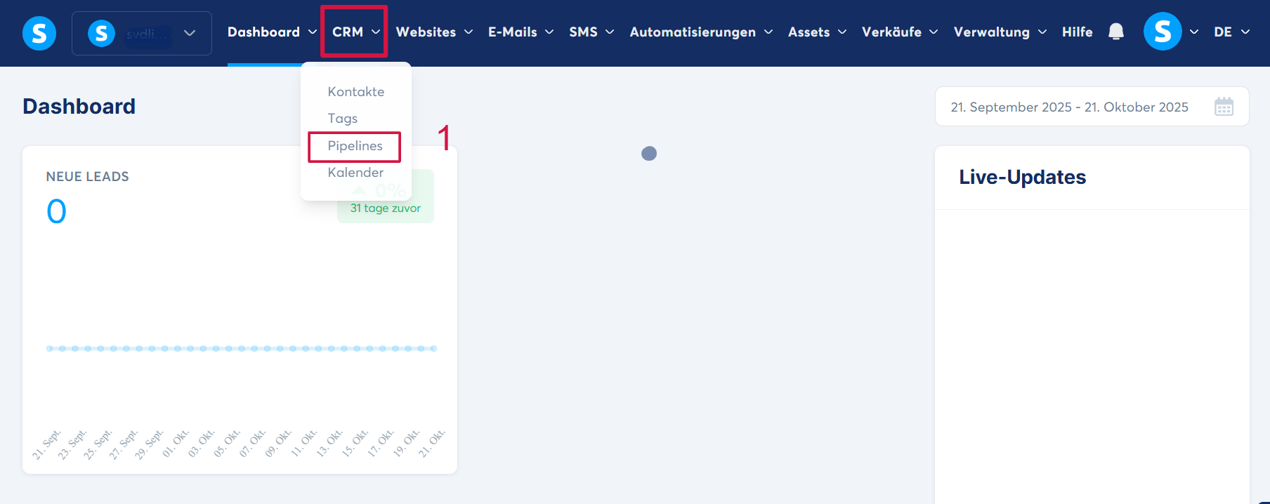 Um eine Pipeline in systeme.io zu erstellen, gehen Sie im Menü Ihres Kontos zum Bereich „CRM“ und klicken Sie auf „Pipelines“ (1).