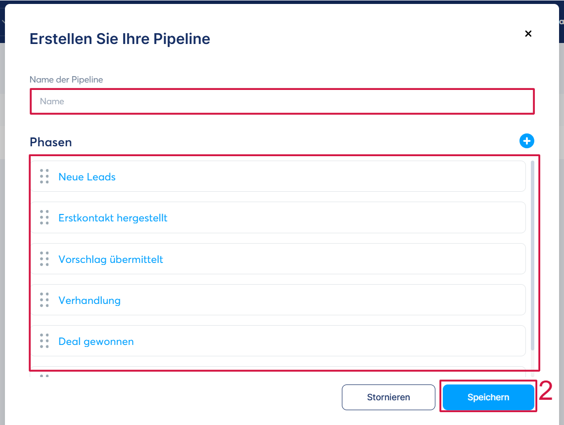 Geben Sie Ihrer Pipeline einen Namen, fügen Sie Schritte/ Phasen hinzu und klicken Sie dann auf „Speichern“, um die Erstellung der neuen Pipeline abzuschließen (2).