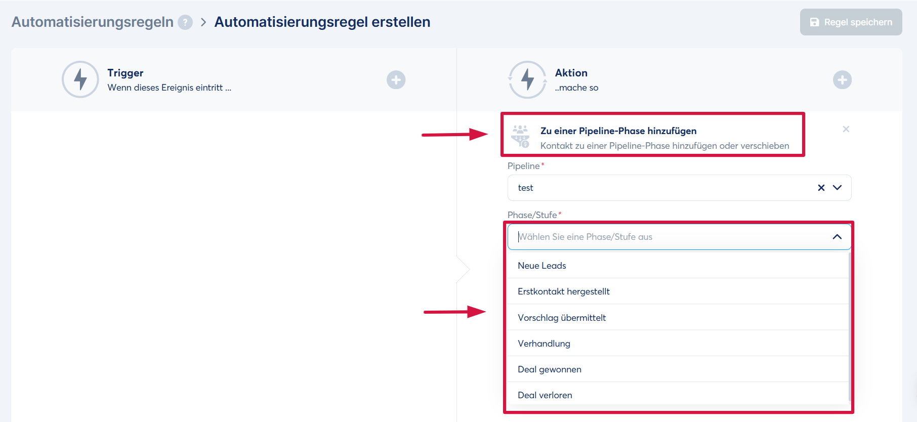 2. Automatisch: indem Sie eine Automatisierungsregel verwenden, um Interessenten zu einem bestimmten Schritt hinzuzufügen oder sie von einem Schritt zum nächsten zu verschieben. Dadurch wird der Prozess reibungsloser und schneller gestaltet. Dies vereinfacht das Chancenmanagement, indem wiederholte manuelle Eingriffe vermieden werden und sichergestellt wird, dass Interessenten korrekt durch die Pipeline geführt werden.