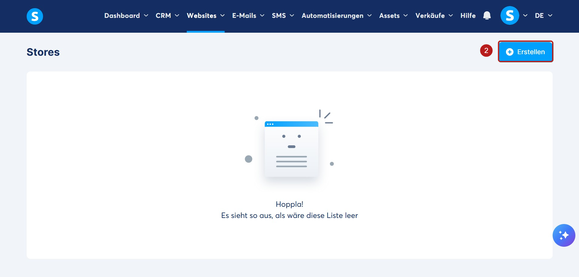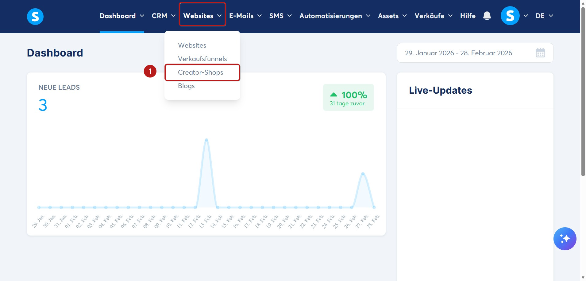 Gehen Sie auf die Schaltfläche Websites und klicken Sie dann auf Creator-Shop (1).