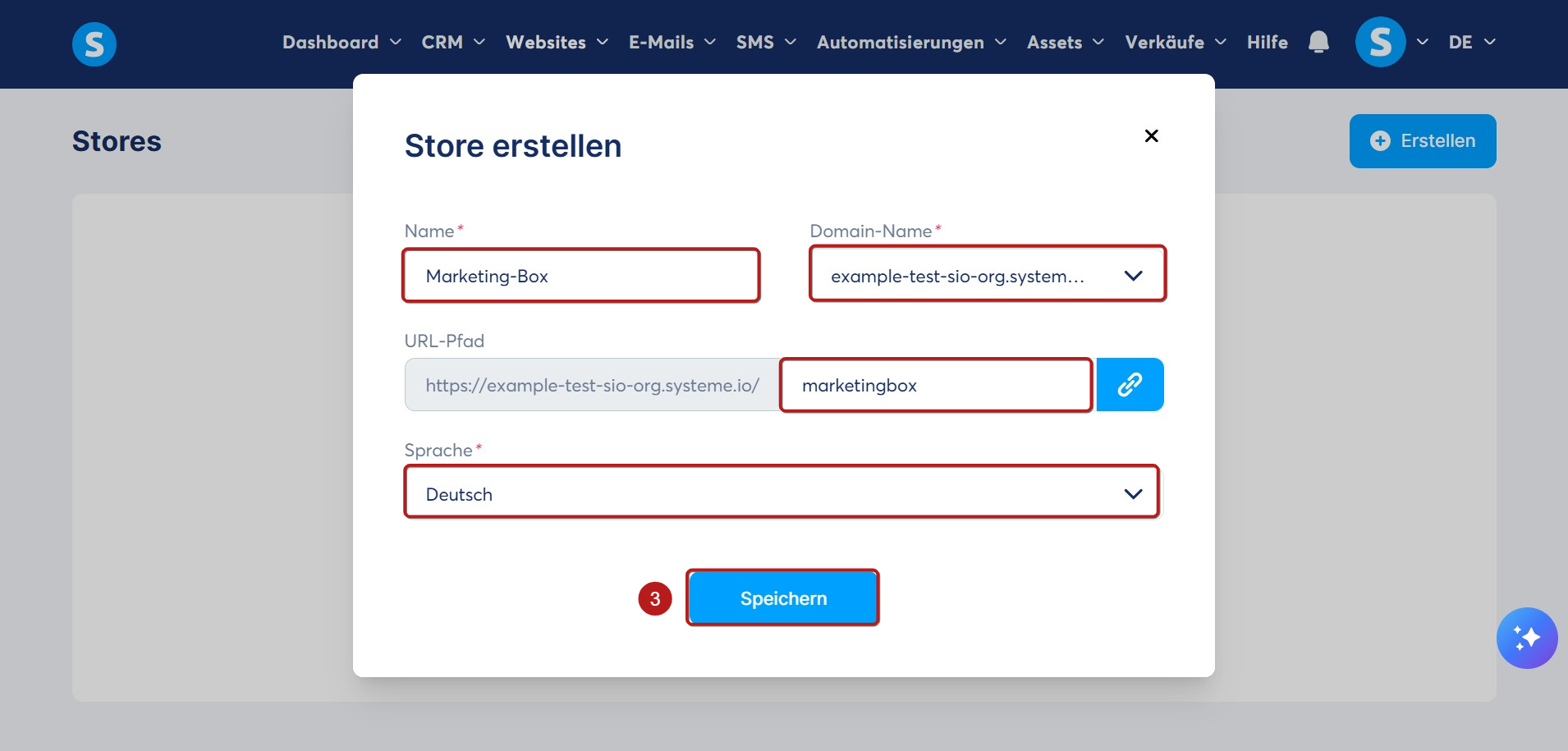 Ein Pop-up-Fenster erscheint, in dem Sie den Namen, die Domain, den URL-Pfad eingeben und die Sprache auswählen müssen. Klicken Sie anschließend auf Speichern (3), um die Erstellung des neuen Creator-Shops abzuschließen.