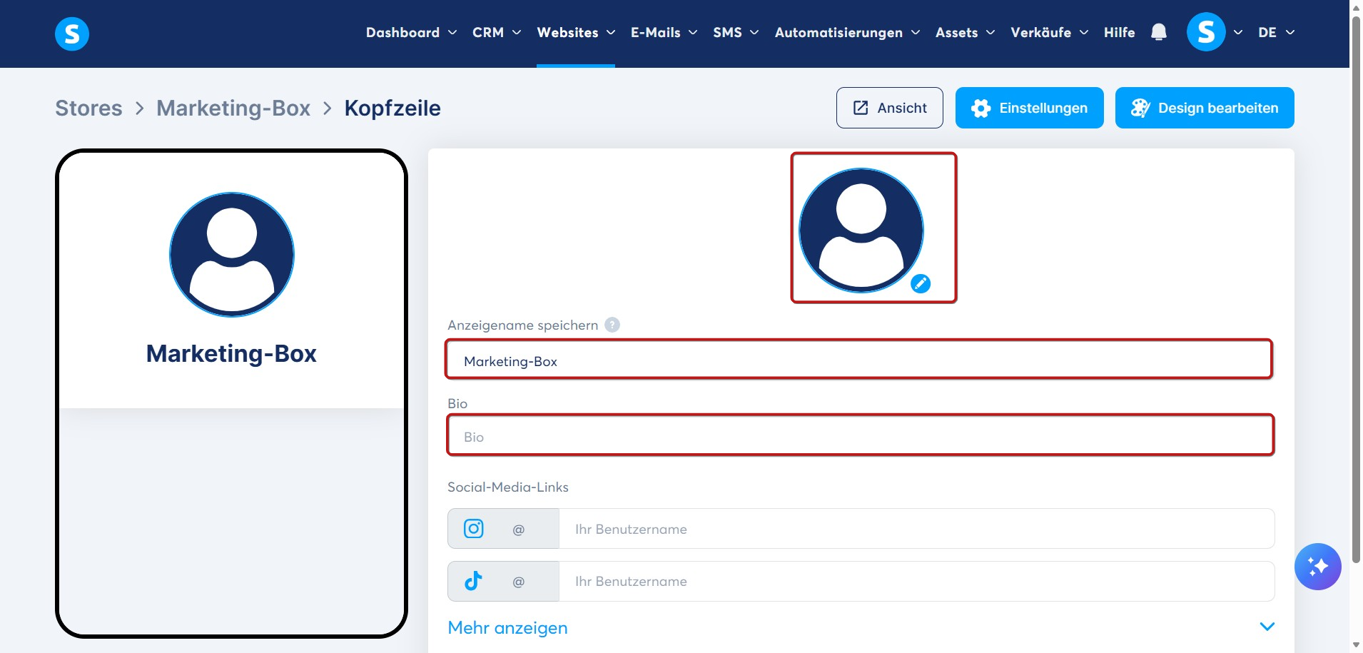 Im Header können Sie das Shop-Bild, den Namen und die Bio bearbeiten.
