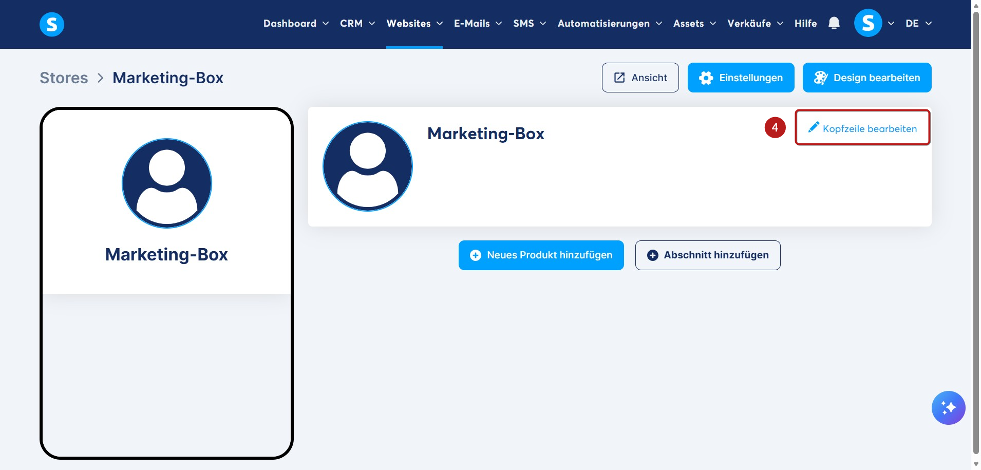 Sie können auf Kopfzeile bearbeiten klicken, um die Kopfzeile Ihres Online-Stores zu ändern (4).