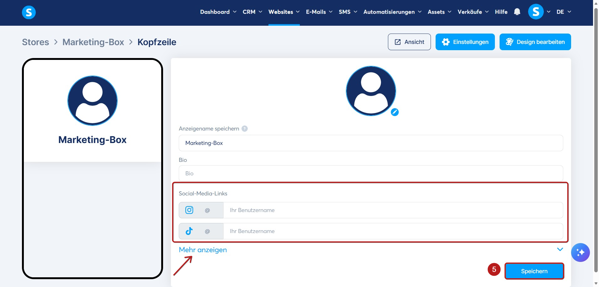 Desweiteren können auch Links zu Ihren Social-Media-Konten hinzufügen, wie Instagram und TikTok. Klicken Sie auf Mehr anzeigen, um alle verfügbaren Optionen zu sehen. Geben Sie anschließend Ihren Benutzernamen ein und klicken Sie auf Speichern (5).