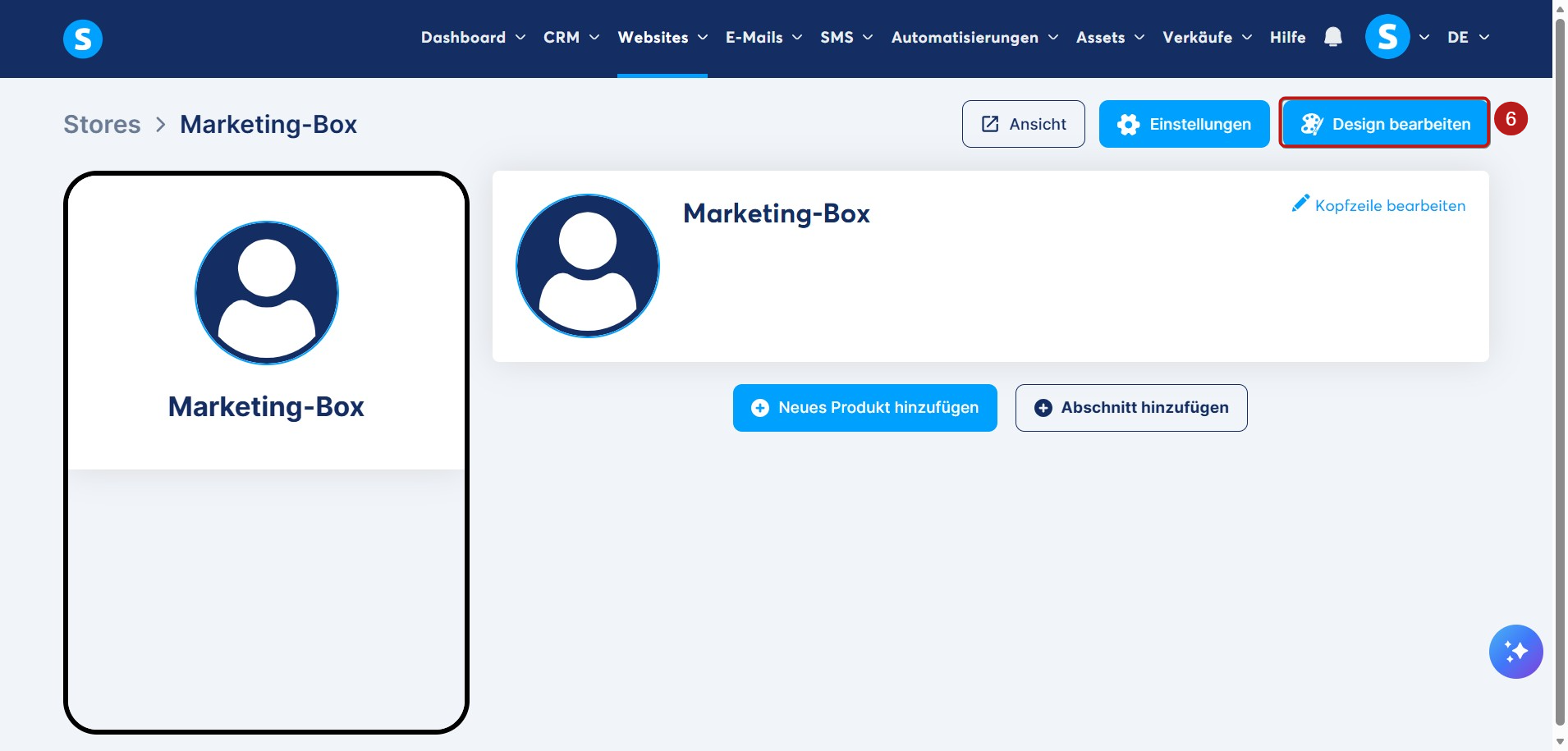 Sie können das Design ändern, indem Sie auf der Homepage Ihres Stores auf Design bearbeiten klicken (6).