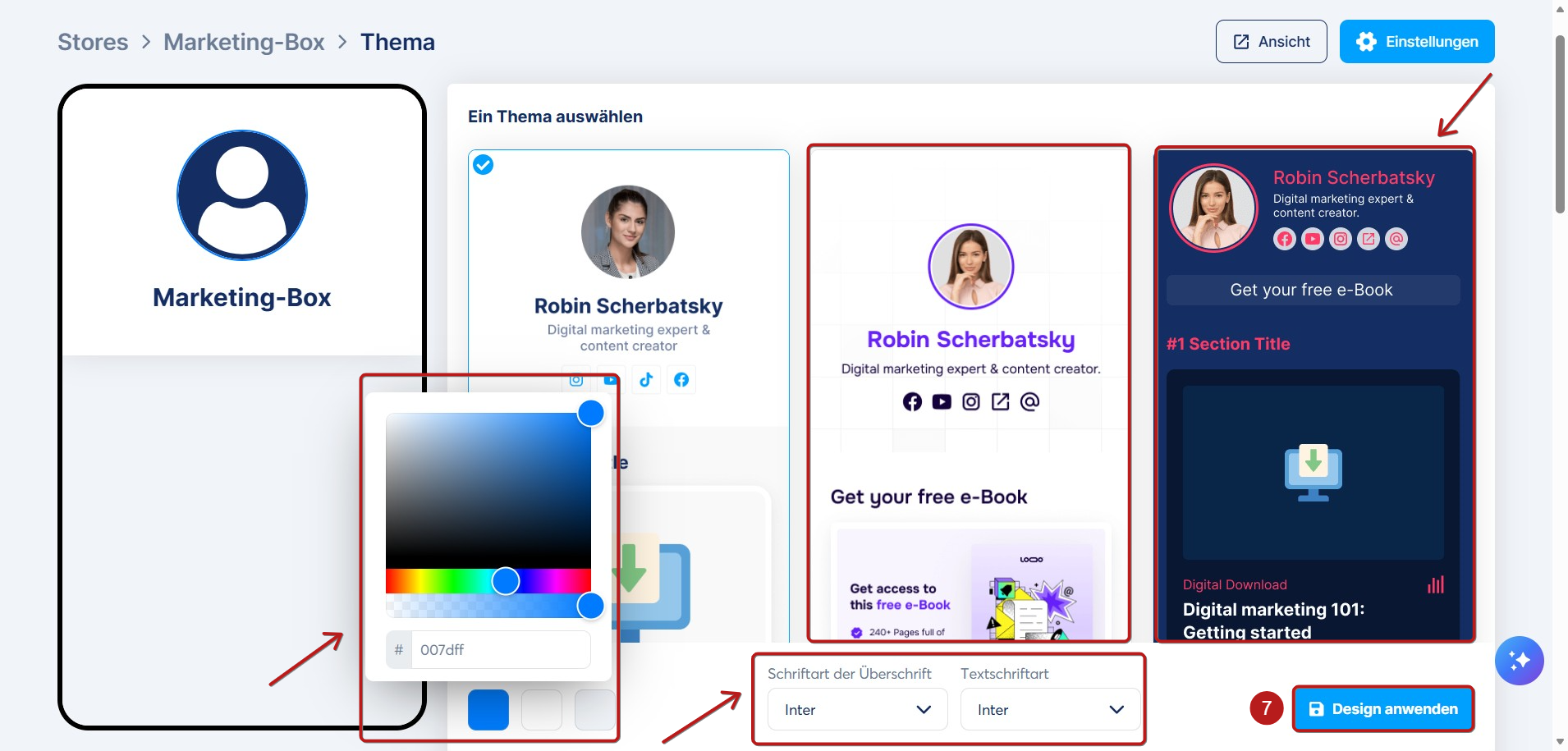 Ihnen stehen mehrere Theme-Vorlagen zur Auswahl. Wählen Sie die Vorlage aus, die Ihnen am besten gefällt, passen Sie Farben, Überschriftenschriftart und Textschriftart über die angezeigten Optionen an und klicken Sie anschließend auf Design anwenden (7), um Ihr Design zu speichern.