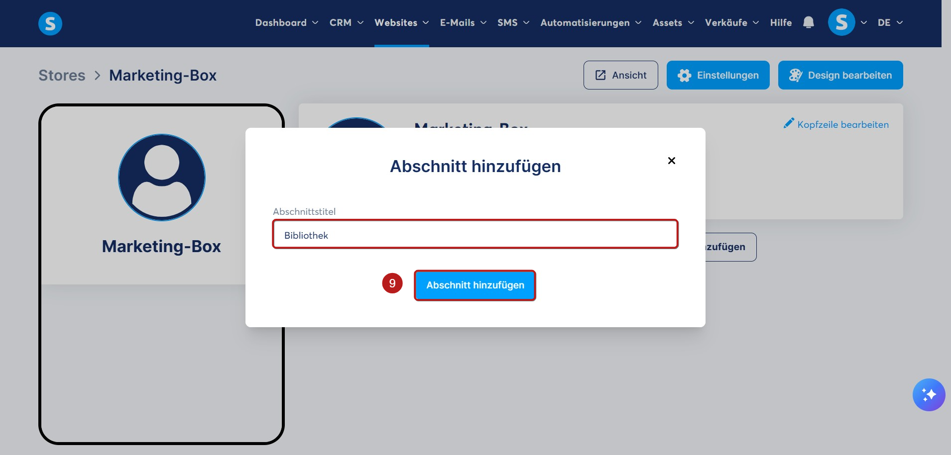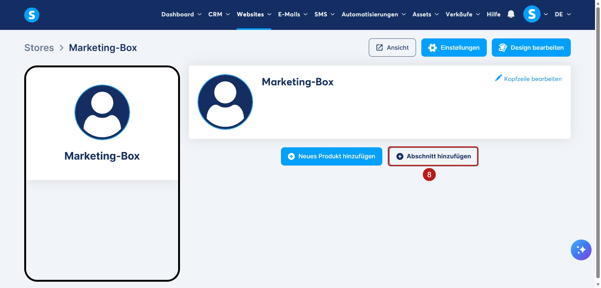 Sie können einen Bereich/ Abschnitt zu Ihrem Store hinzufügen, indem Sie auf Abschnitt hinzufügen klicken (8).