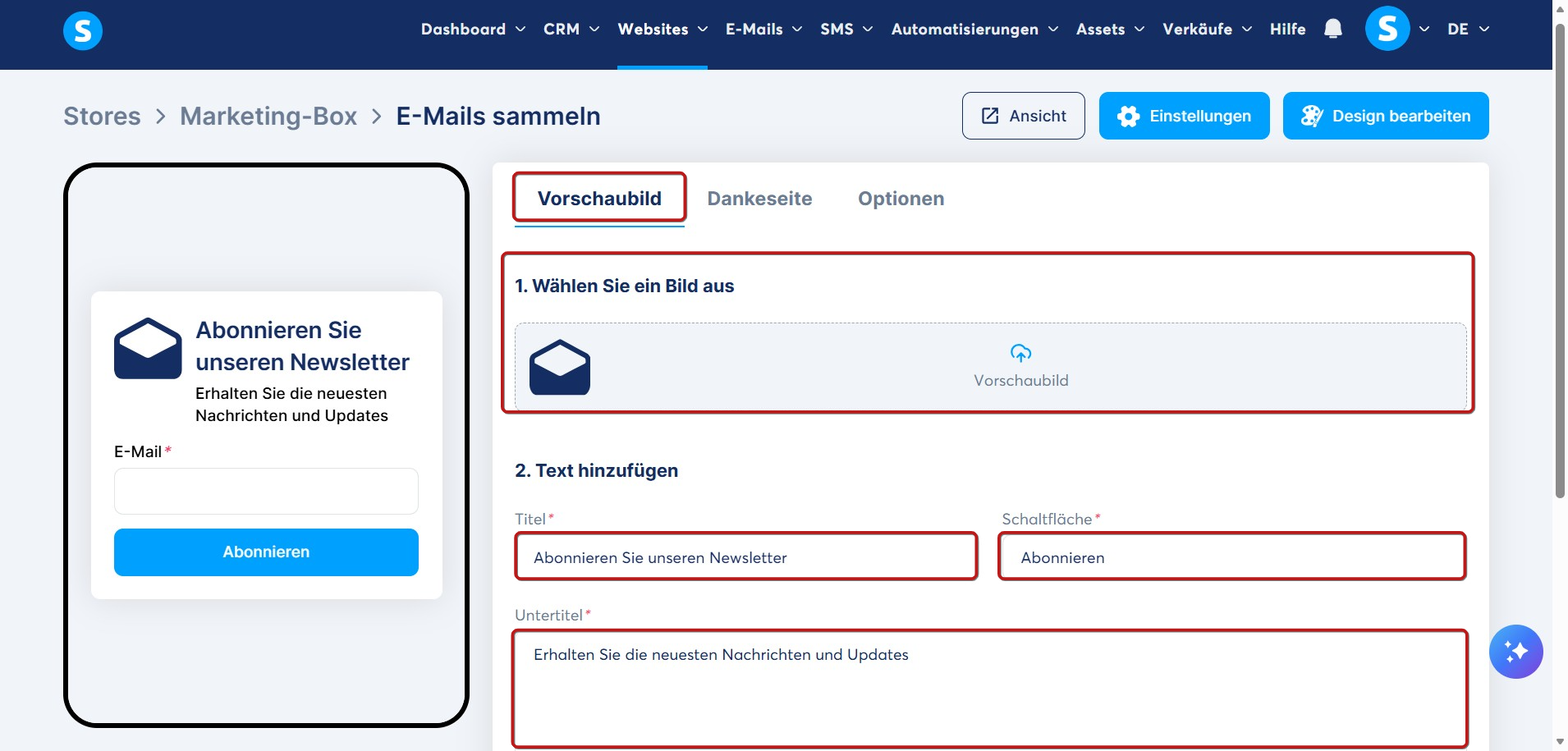 1. Vorschaubild: Hier wählen Sie das gewünschte Vorschaubild aus und können zudem den Titel, den Button und den Untertitel bearbeiten.