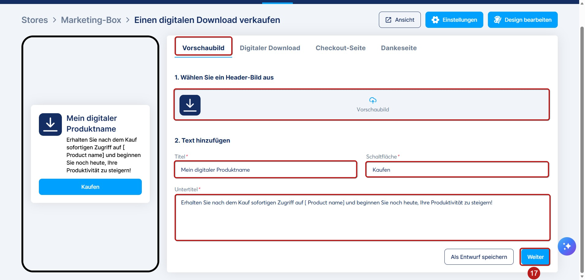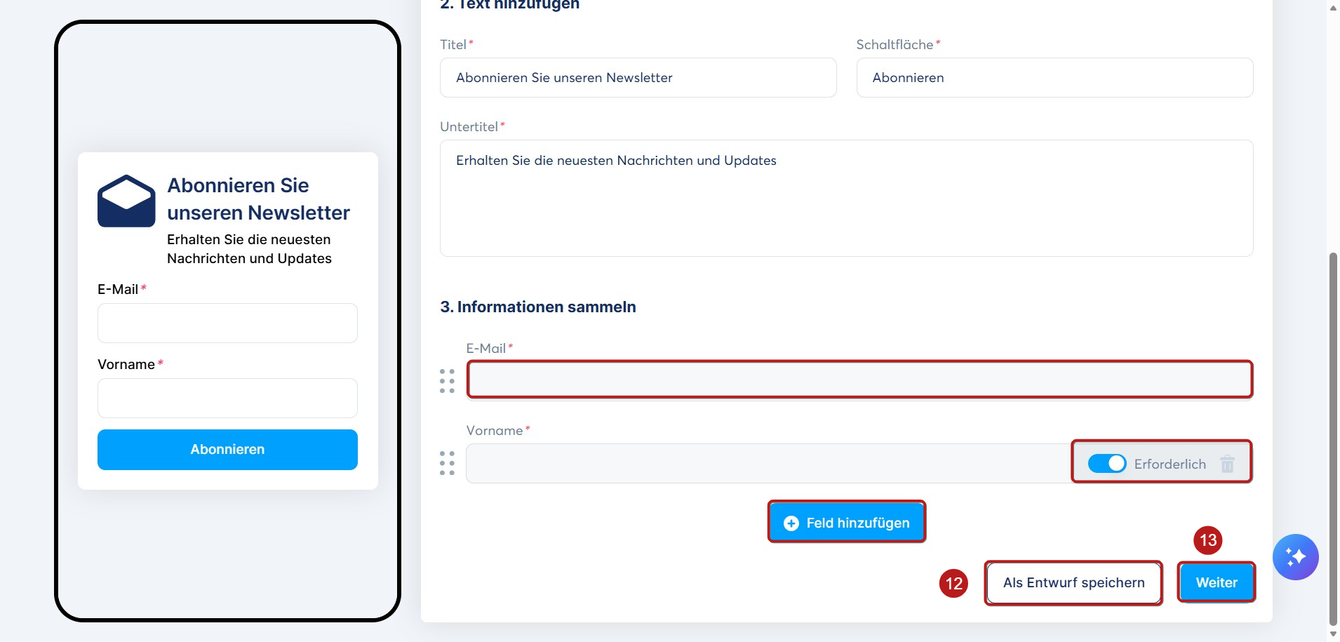 Wenn alles eingerichtet ist, können Sie Ihre Änderungen speichern, indem Sie auf Als Entwurf speichern (12) klicken, oder auf Weiter, um zu speichern und zum zweiten Tab fortzufahren (13).