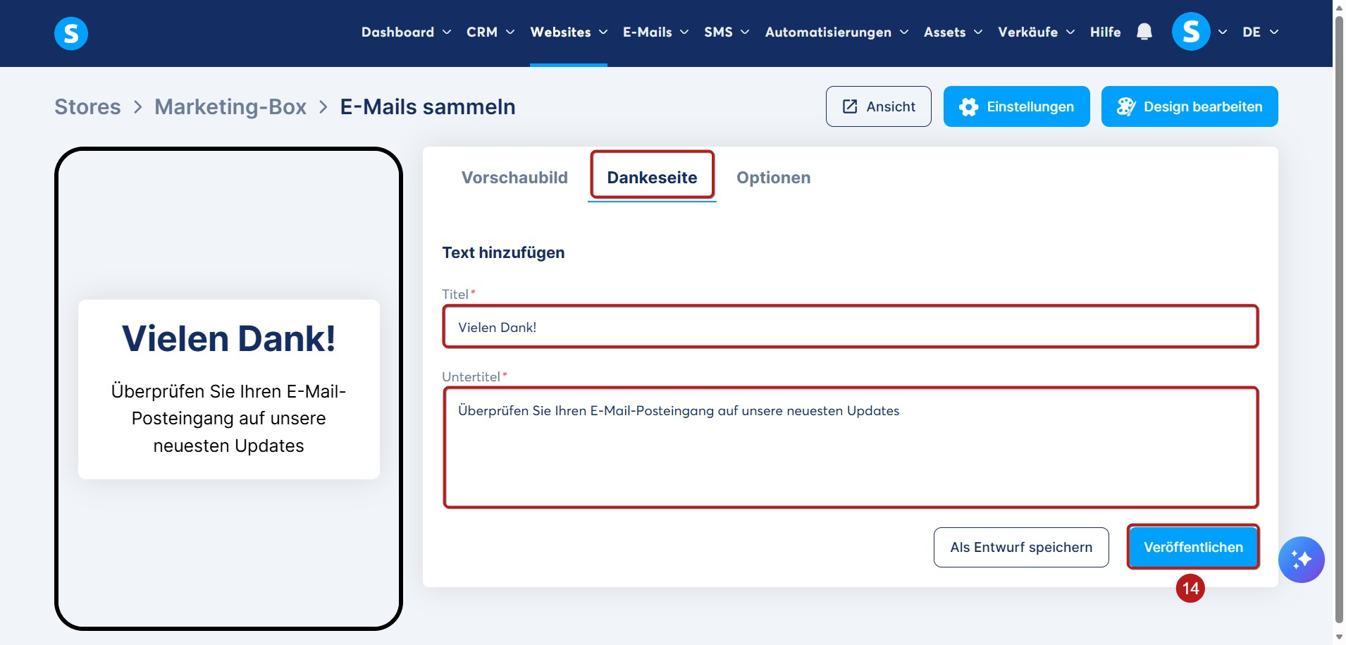 Zum Schluss müssen Sie auf Veröffentlichen klicken, damit Ihr E-Mail-Sammelprodukt in Ihrem Store sichtbar wird (14).