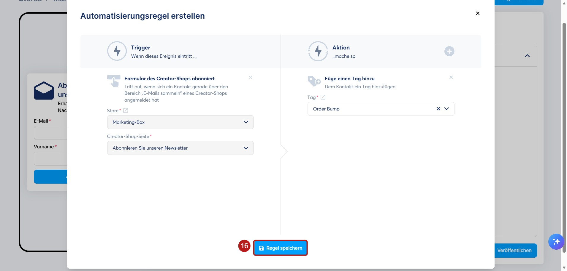 Wählen Sie im angezeigten Pop-up-Fenster Digitales Shop-Formular abonniert als Auslöser aus und wählen Sie anschließend die Aktion, die nach der Anmeldung eines Leads über den Bereich E-Mails sammeln Ihres digitalen Shops ausgelöst werden soll (in diesem Beispiel haben wir Tag hinzufügen ausgewählt). Klicken Sie abschließend auf Regel speichern (16).
