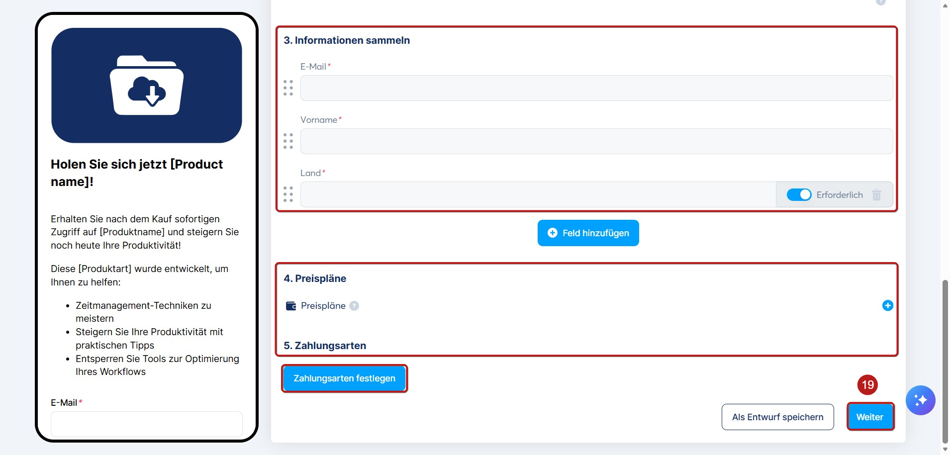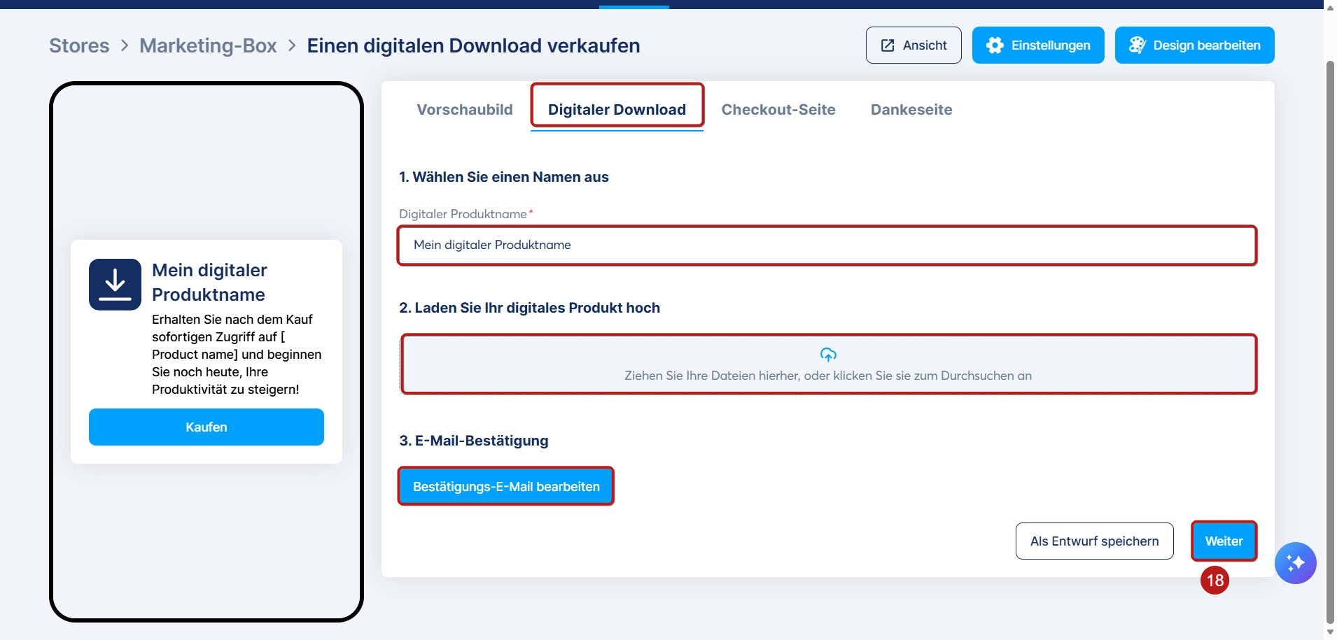 2. Digitaler Download: Geben Sie Ihrem digitalen Produkt einen Titel, laden Sie die Datei hoch und bearbeiten Sie die Bestätigungs-E-Mail, die nach der Zahlung automatisch an Ihre Kunden gesendet wird.