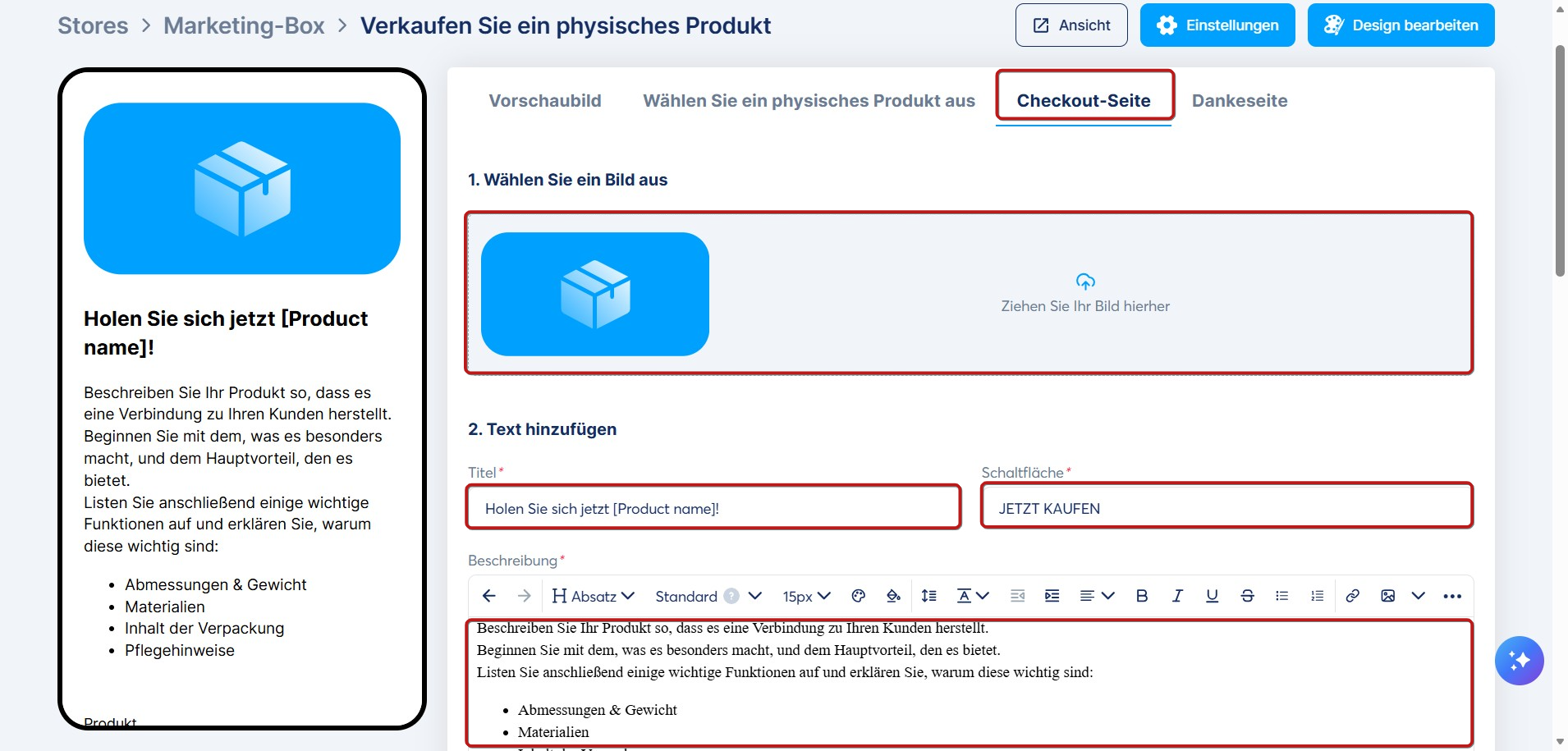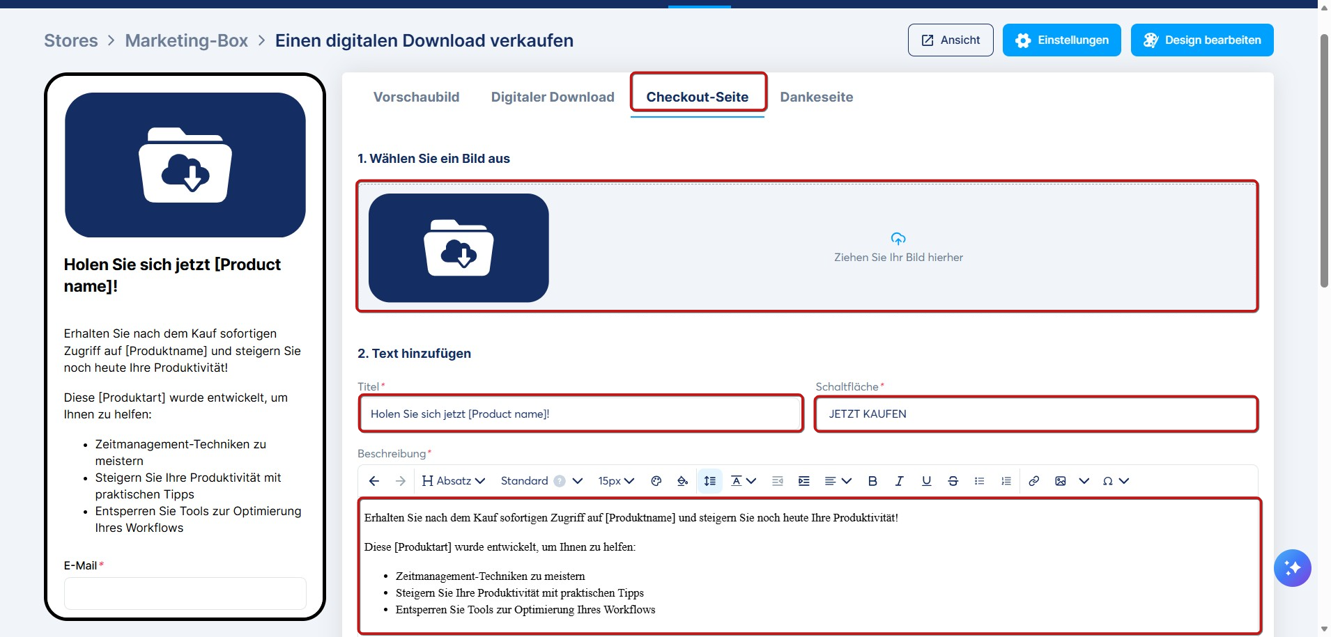 3. Checkout-Seite (Zahlungsseite): Fügen Sie ein Bild für Ihr Produkt hinzu sowie einen Text, der den Titel, den Button und die Beschreibung enthält.