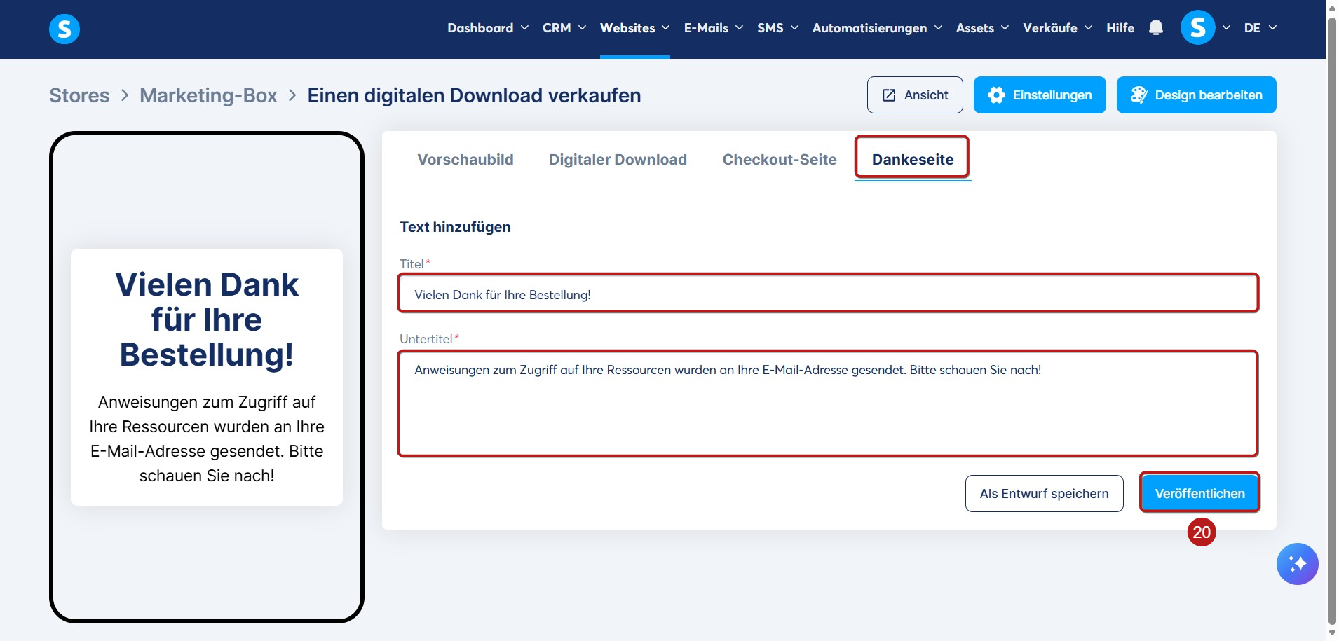 Klicken Sie abschließend auf Veröffentlichen (20), damit Ihr Verkaufsprodukt in Ihrem Shop sichtbar wird.
