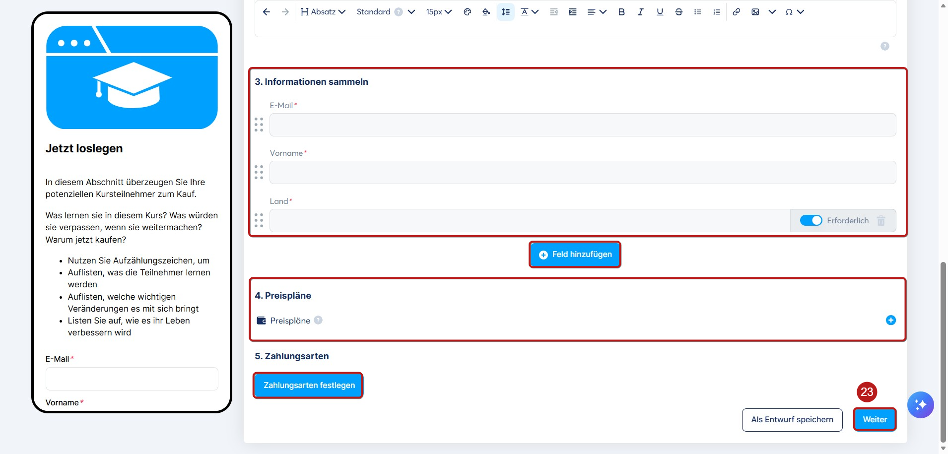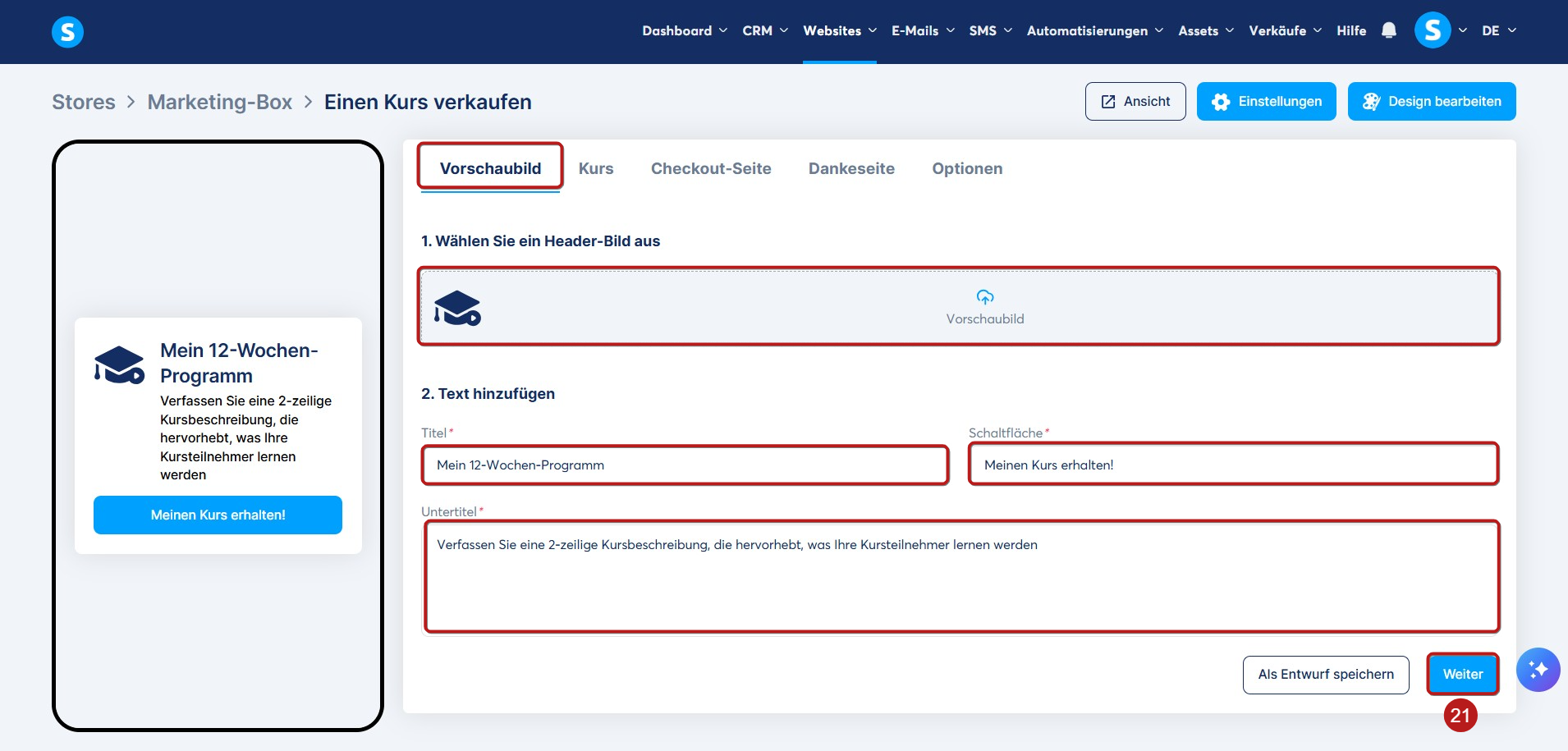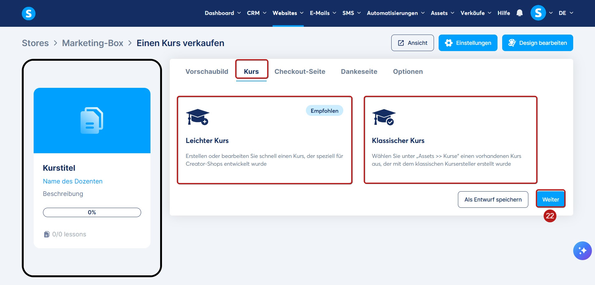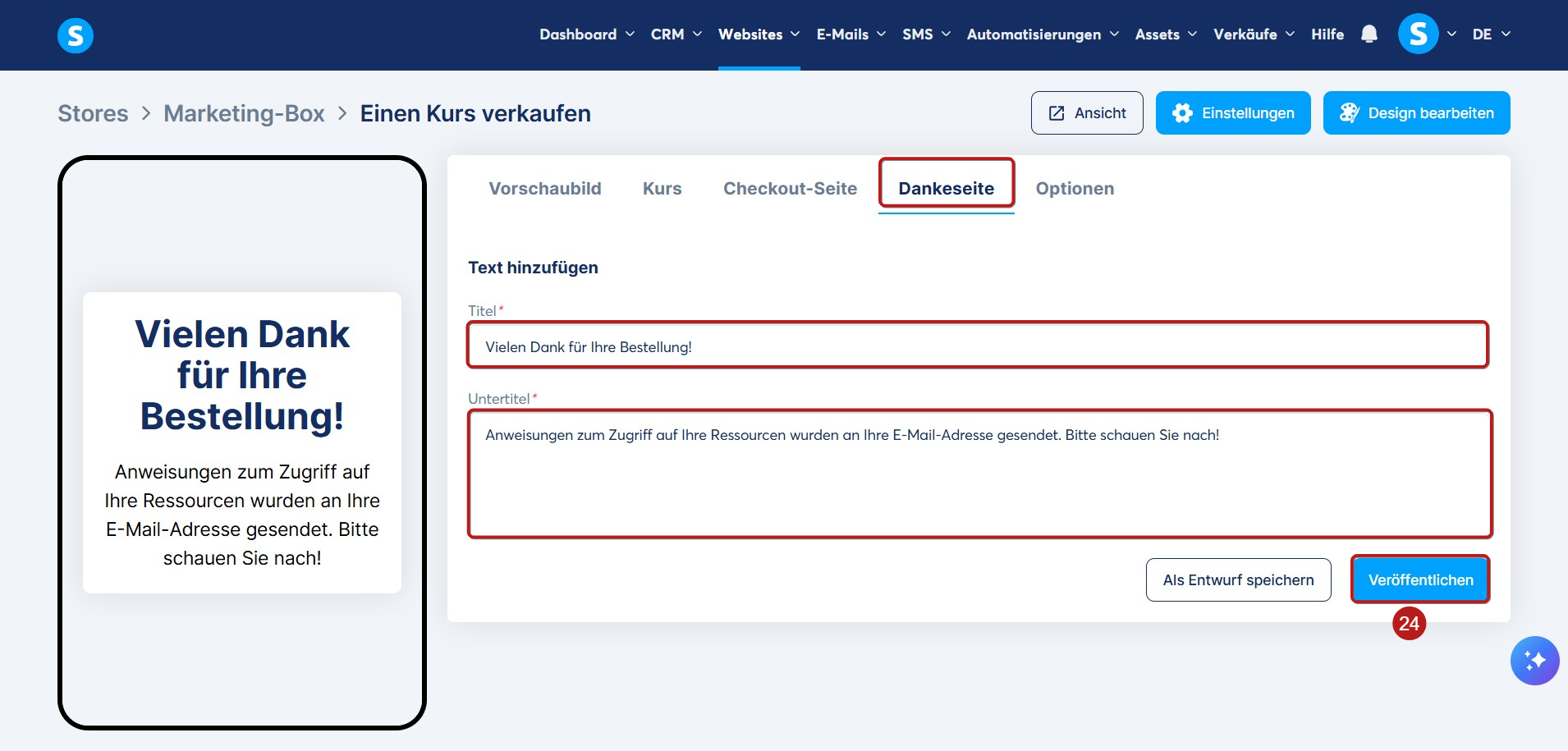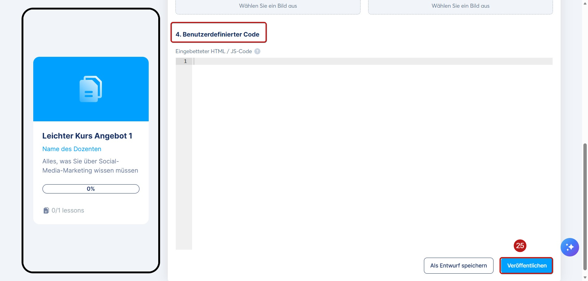 Klicken Sie anschließend auf Veröffentlichen (25), um Ihre Änderungen zu speichern und den Kurs in Ihrem Shop verfügbar zu machen.