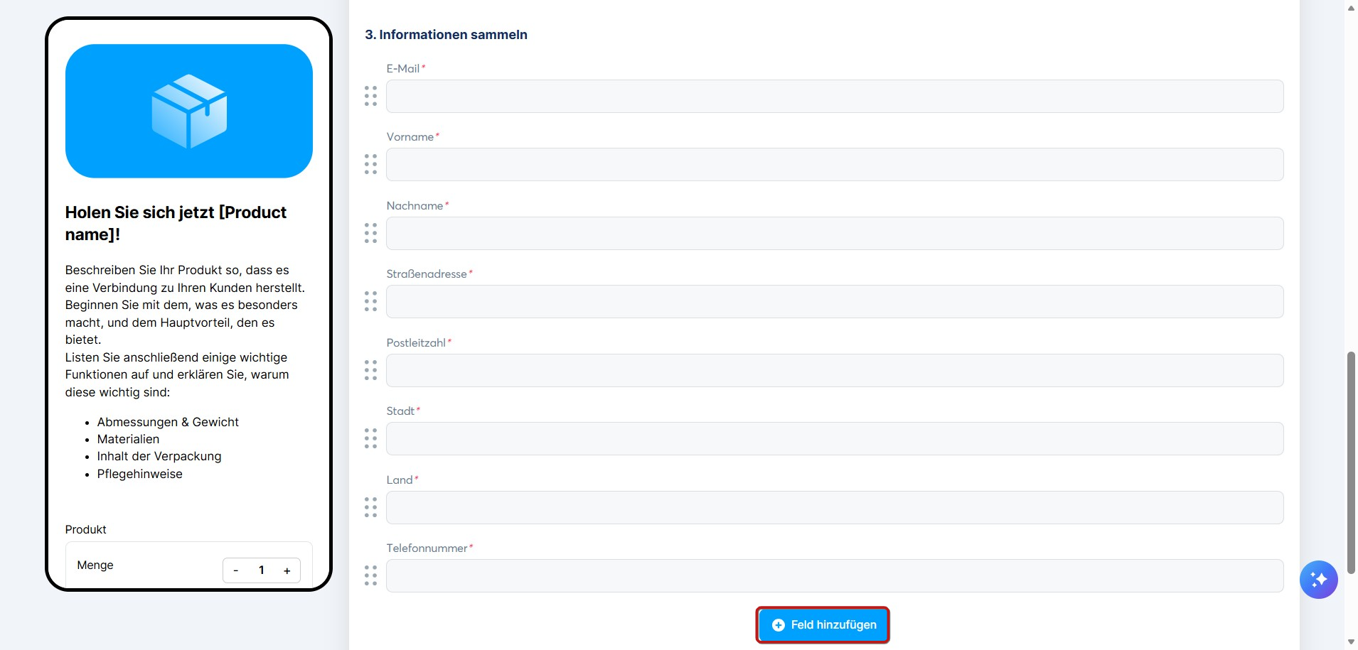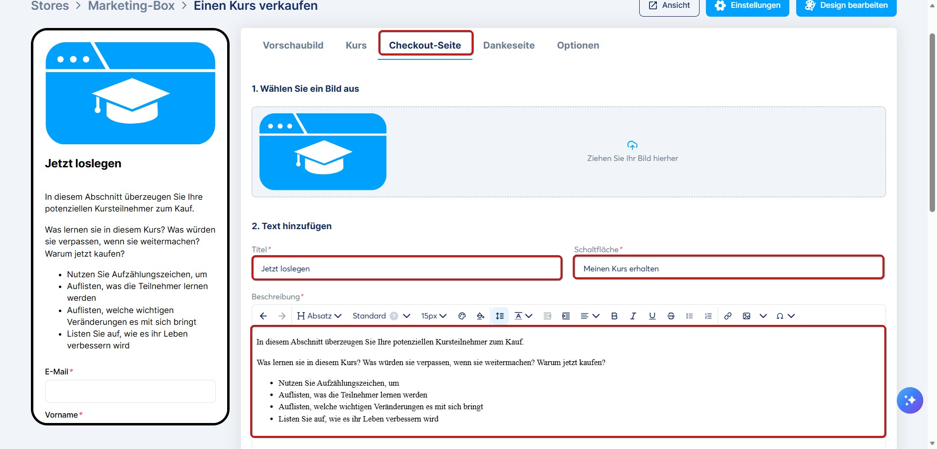3. Checkout-Seite (Zahlungsseite): Fügen Sie ein Bild für Ihr Produkt hinzu sowie einen Text, der den Titel, einen Button und eine Beschreibung enthält.