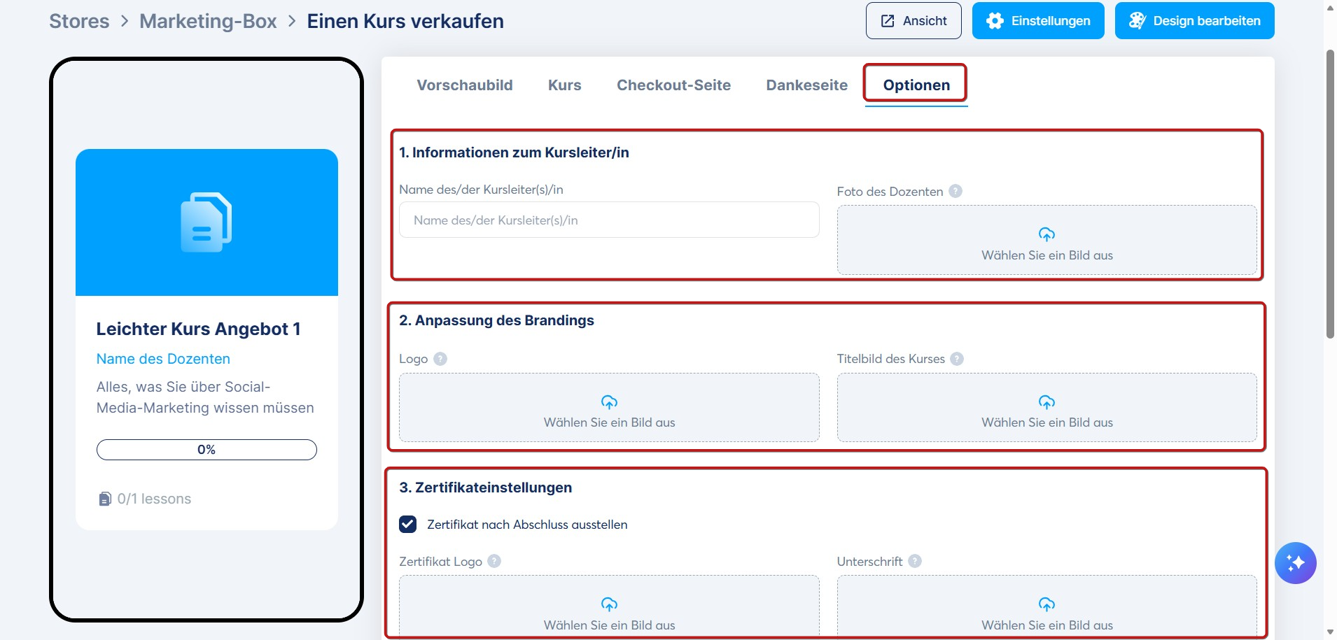 Fügen Sie die Informationen des Dozenten hinzu (Name und Foto), passen Sie das Branding an, indem Sie Ihr Logo und das Kurs-Cover hochladen, und richten Sie die Zertifikateinstellungen ein, z. B. durch Hinzufügen eines Zertifikatslogos und einer Unterschrift oder durch Aktivierung der Option, ein Zertifikat nach Abschluss auszustellen.