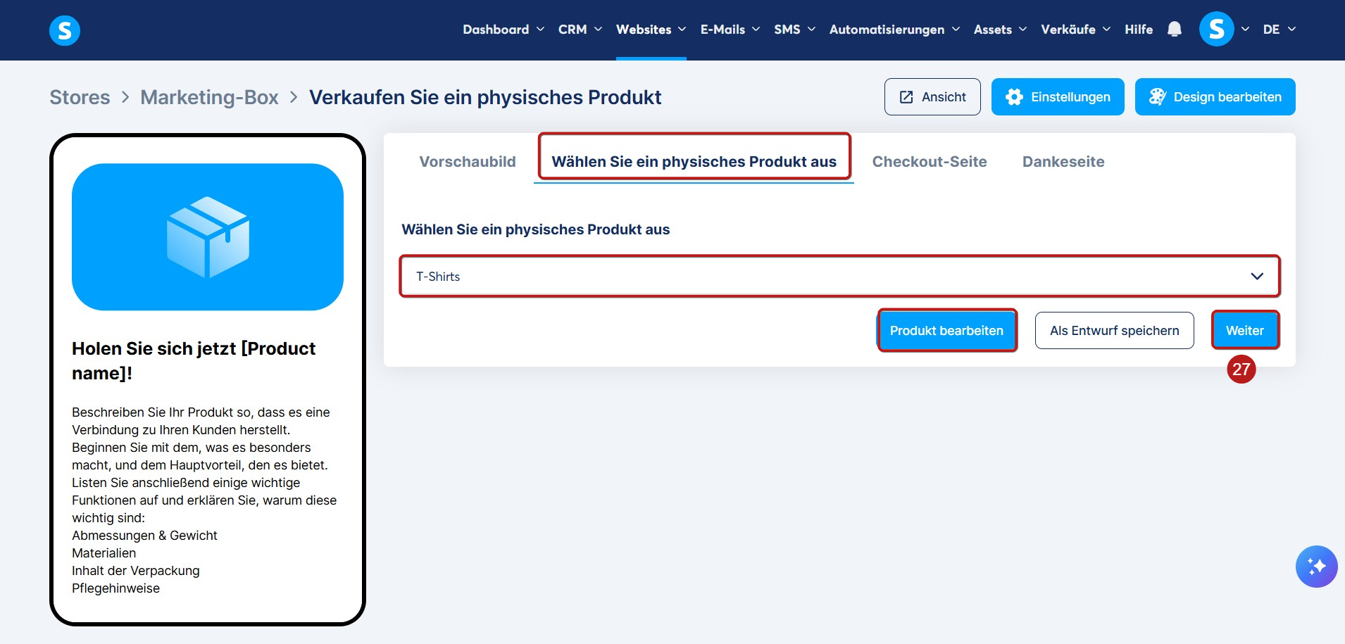 2. Physisches Produkt auswählen: Wählen Sie ein physisches Produkt aus, das bereits in Ihrem systeme.io-Konto erstellt wurde. Sobald es ausgewählt ist, können Sie es bearbeiten, indem Sie auf Produkt bearbeiten klicken.