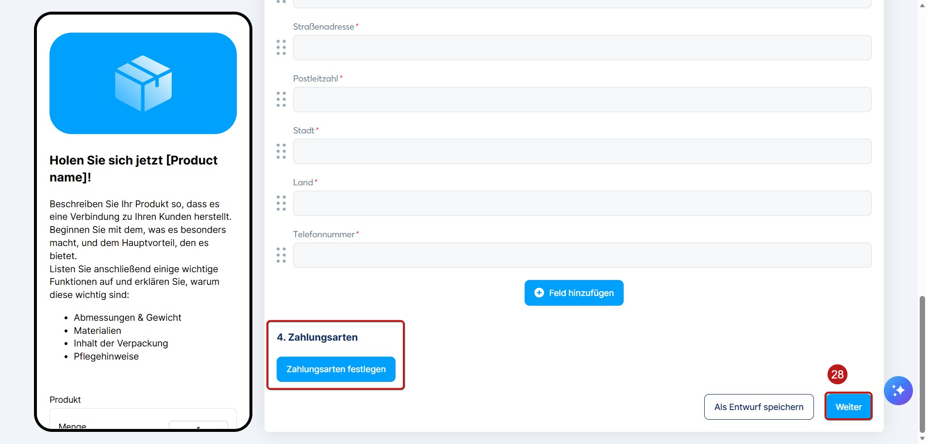 Wählen Sie die bevorzugte Zahlungsmethode aus, indem Sie auf Zahlungsmethoden festlegen klicken, und klicken Sie anschließend auf Veröffentlichen (28), um zum letzten Tab zu gelangen.