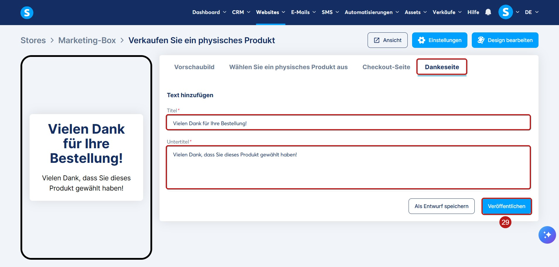 4. Dankeseite: Fügen Sie einen Titel sowie einen Untertitel hinzu, die angezeigt werden, nachdem der Kunde seinen Kauf bestätigt hat.