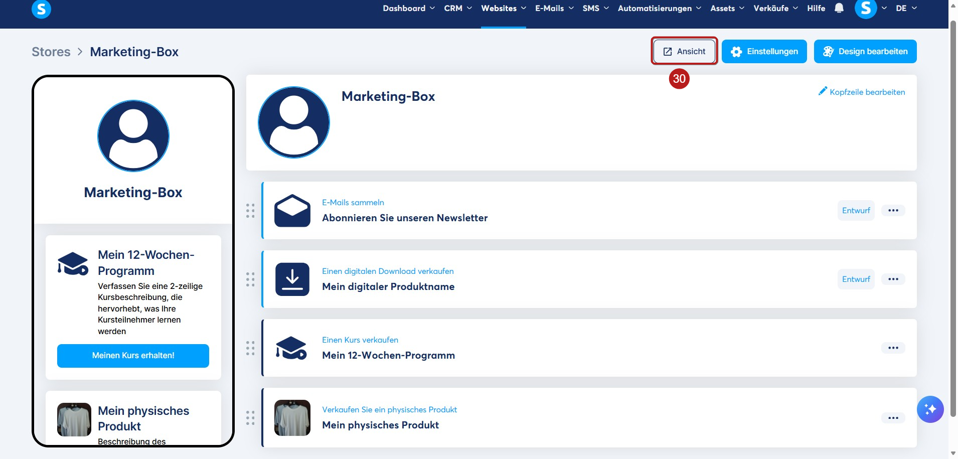 Um die endgültige Darstellung Ihres Stores zu sehen, klicken Sie auf Ansicht (30).
