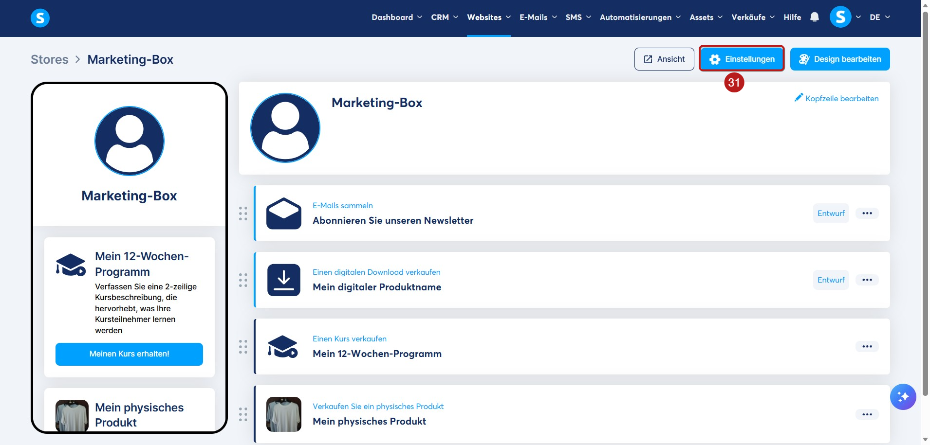 Sobald Sie Ihre digitalen Produkte veröffentlicht haben, können Sie die verschiedenen Einstellungen Ihres digitalen Shops konfigurieren. Klicken Sie dazu auf Einstellungen (31).