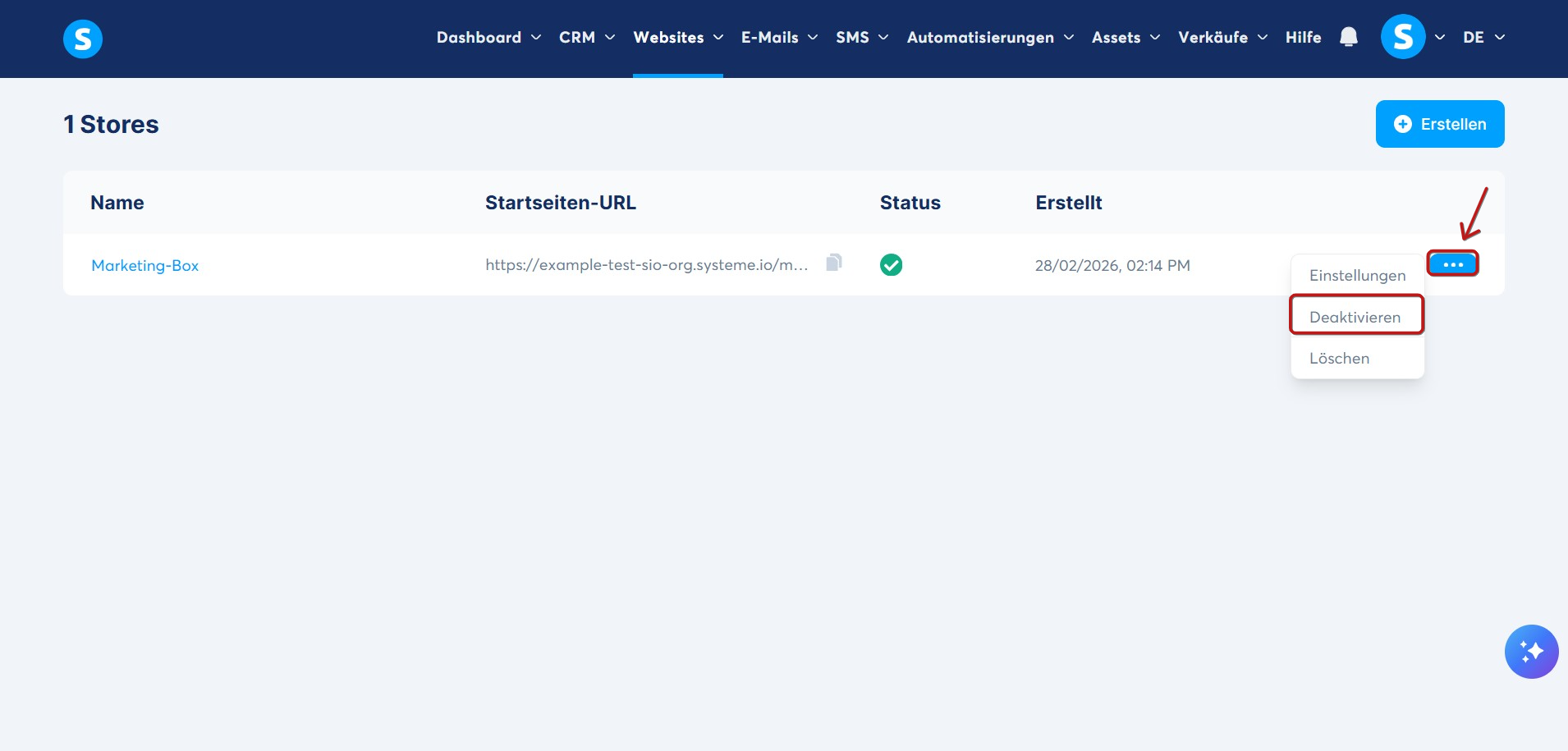 - Es ist möglich, einen digitalen Shop zu deaktivieren. Klicken Sie auf den entsprechenden digitalen Shop, dann auf das 3-Punkte-Menü und wählen Sie Deaktivieren.